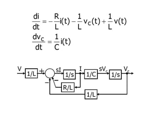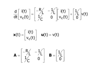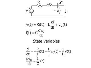 State variable models provide more internal information about a system compared to transfer function models, allowing for more complete control system design and analysis. The state of a system is defined as the minimum amount of information needed to uniquely determine the future behavior of the system given the inputs. State variable models are written in standard state space form with state, input, and output equations relating the state vector x, input vector u, and output vector y. An example RLC circuit is modeled using state space equations, and the solution is obtained using Laplace transforms.