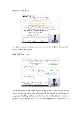 - It describes deriving the plant transfer function, choosing an initial proportional controller, and analyzing the closed-loop stability and performance using root locus analysis.