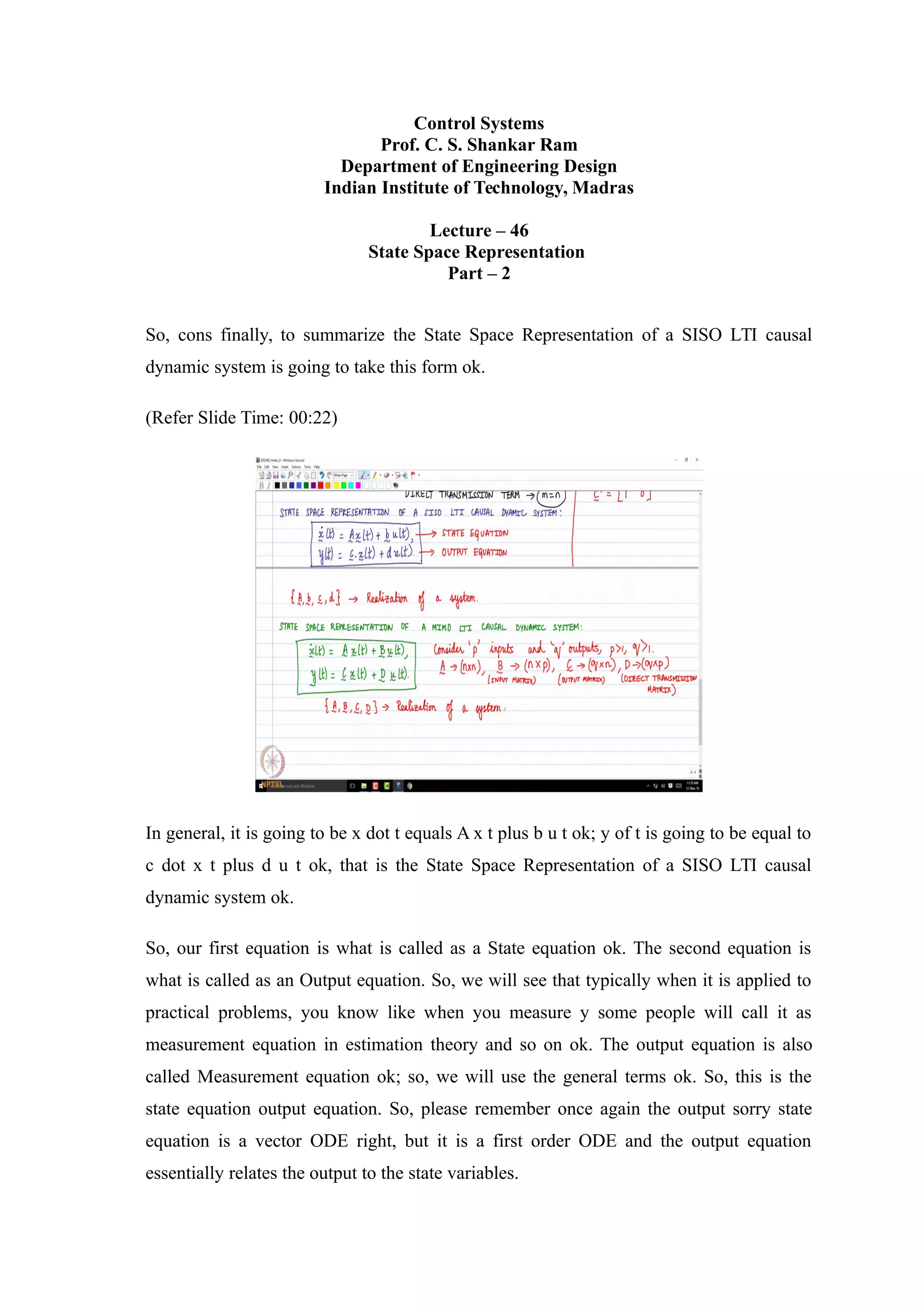 1. The state space representation of a single-input single-output (SISO) LTI system is given by x ̇(t) = Ax(t) + bu(t) and y(t) = cx(t) + du(t), where x(t) is the state vector, u(t) is the input, y(t) is the output, and A, b, c, d are matrices that characterize the system.