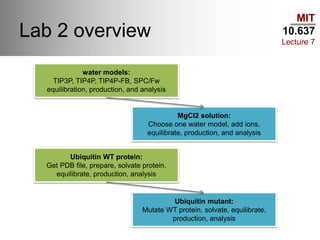 This document outlines the procedures and tools used in a classical molecular dynamics lab as part of MIT's course 10.637. It covers various water models, procedures for preparing and analyzing protein structures, commands for using the Slurm queue on the Maverick machine, and command-line tips for efficient navigation and file management. The content is geared towards helping students set up their computational environment and manage simulations effectively.
