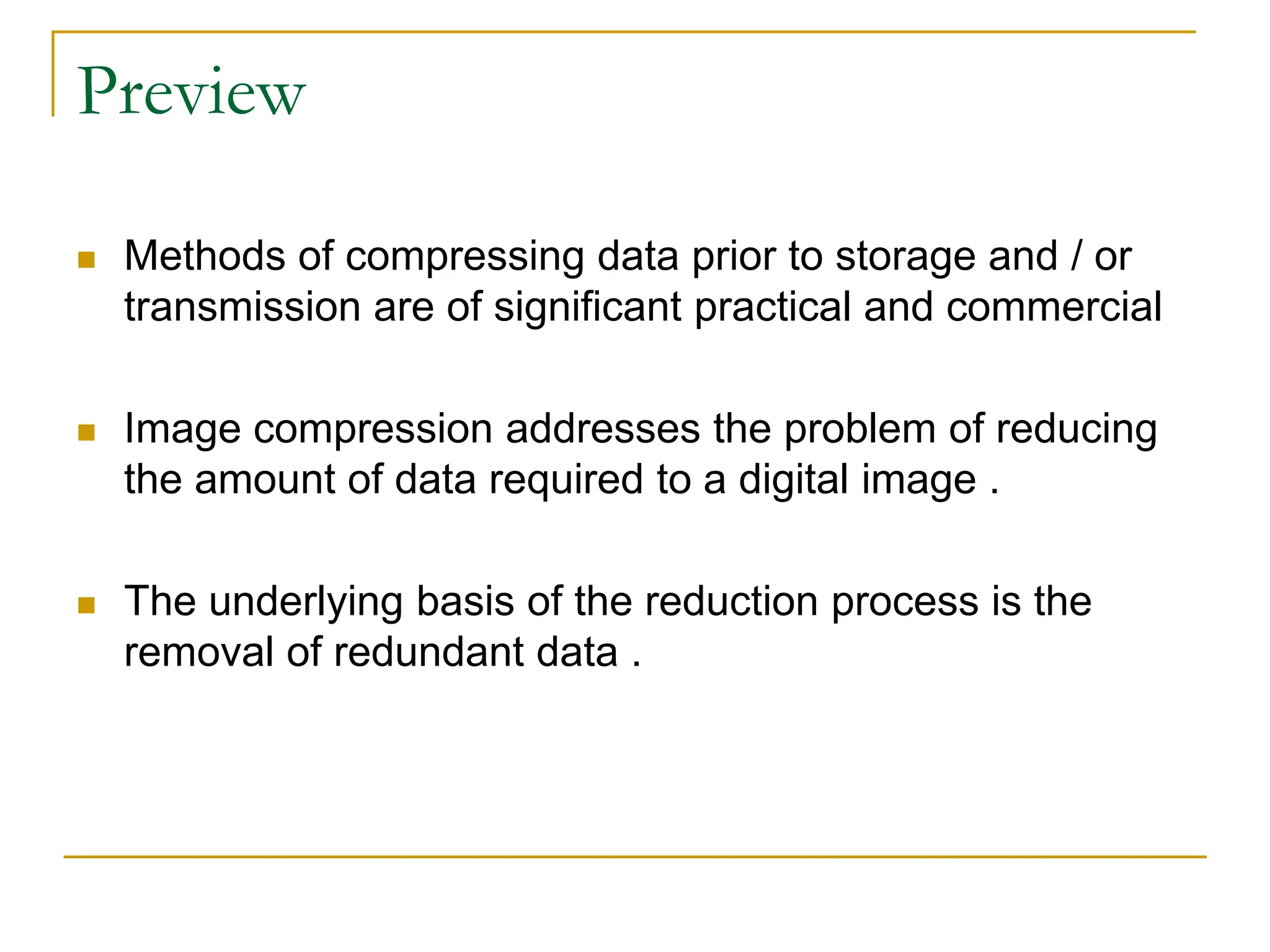 The document then discusses three main types of data redundancy that can be reduced: coding redundancy, spatial/temporal redundancy, and irrelevant information redundancy. Coding redundancy refers to inefficient coding of pixel values and can be reduced using techniques like Huffman coding or arithmetic coding. Spatial/temporal redundancy occurs from correlations between neighboring pixel values, while irrelevant information redundancy refers to data that is ignored by the human visual system.