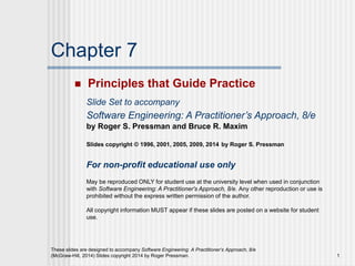 This document contains summaries of principles that guide various aspects of software engineering such as process, practice, modeling, construction, testing, and deployment. It lists over 100 principles across 24 slides related to topics like being agile, focusing on quality, adapting processes, effective communication, managing risk, and testing exhaustively but recognizing limits. The document is designed to accompany a software engineering textbook and provide high-level guidance for practitioners.