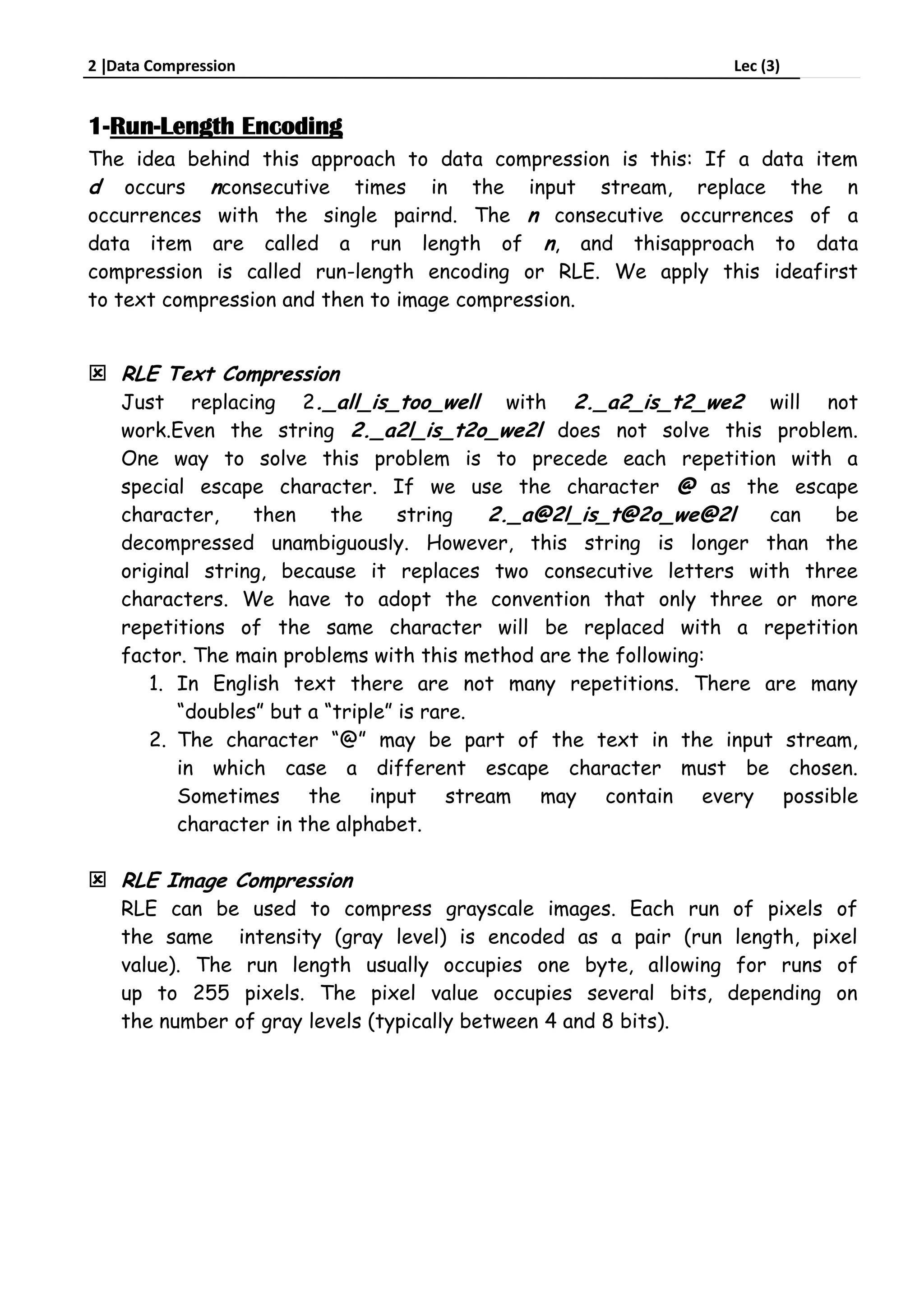 Run-length encoding is a data compression technique that replaces consecutive repeating characters with the character and number of repeats. It can be used to compress text by replacing strings like "aabbcc" with "a2b2c2". For images, runs of pixels with the same intensity value are encoded as a pair of the run length and pixel value. Huffman coding assigns variable-length binary codes to symbols based on their frequency, with more common symbols getting shorter codes to compress data more efficiently than fixed-length codes.