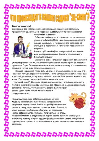 В ближайшие две недели посвящены фестивалю шаббата, где дети узнали о значении и атрибутах этого праздника, включая обряды кидуша и символ халы. В ходе занятий они создавали поделки, изучали математику и окружающий мир, а также обсуждали важность хлеба. На музыкальном досуге ребята пели и танцевали, делая время весёлым и полезным.