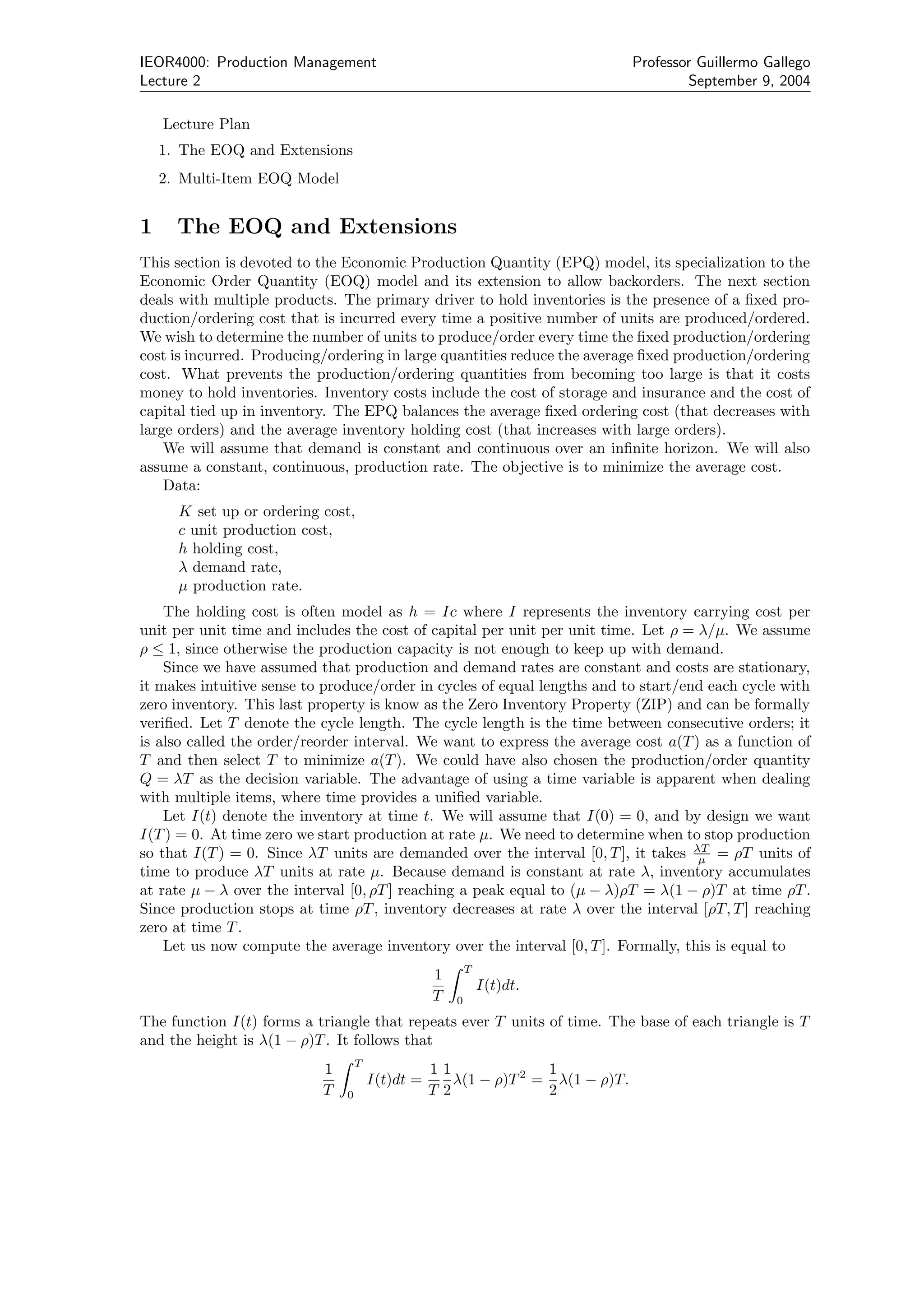 The document summarizes the economic production quantity (EPQ) model and its extensions. It discusses: