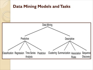 The document discusses the field of data mining. It begins by defining data mining and describing its branches including classification, clustering, and association rule mining. It then discusses the growth of data in various domains that has created opportunities for data mining applications. The document outlines the history and development of data mining from empirical science to computational science to data science. It provides examples of data mining applications in various domains like healthcare, energy, climate science, and agriculture. Finally, it discusses future directions and challenges for the field of data mining.