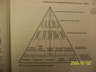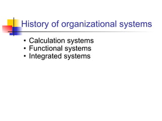This document provides an overview of the history and evolution of organizational systems from calculation systems to integrated enterprise resource planning (ERP) systems. It discusses the transition from single purpose mainframe systems in the 1950s-1980s to functional departmental systems in the 1975-2000 period to modern integrated ERP systems. The benefits of ERP systems include a common set of integrated data and processes to help with decision making and planning across departments. However, ERP implementations are also very difficult, costly, and time-intensive projects that require careful planning and change management to be successful.