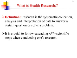 The document discusses health research, including definitions, purposes, objectives, categories, and importance. It defines research as the systematic collection, analysis and interpretation of data to answer questions or solve problems. The purposes of research are to validate and generate new knowledge about nursing practice, education, administration and informatics. Research objectives include general exploration, describing populations, and determining cause-and-effect relationships. The categories of research design are exploratory, descriptive and causal. Research is important as it adds knowledge, improves practice, informs policy debates, and builds student research skills.