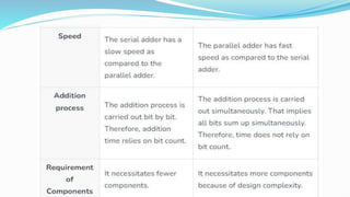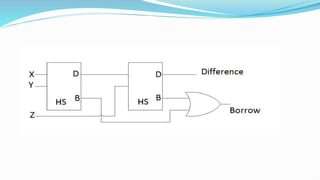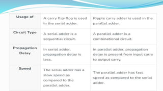 This document provides an overview of combinational logic circuits including half adders, full adders, half subtractors, full subtractors, multiplexers, demultiplexers, encoders, decoders, binary coded decimal adders, arithmetic logic units, and the differences between serial adders and parallel adders. Combinational logic circuits have outputs that are a function of the present inputs only. Common combinational logic elements and their applications are described.