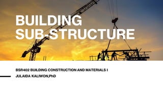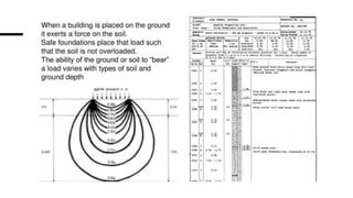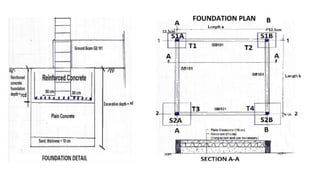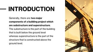 The document discusses substructure and foundations of buildings. It defines substructure as the lower part of a building constructed below ground level, which transfers loads from the superstructure to the underlying soil. Foundations are classified as shallow or deep, with shallow foundations used for smaller, lighter buildings in depths up to 3 meters, and deep foundations for larger, heavier buildings at depths over 20 meters. Shallow foundation types include individual footings, combined footings, strip foundations, and raft/mat foundations. The document provides details on the design and purpose of each type of shallow foundation.
