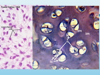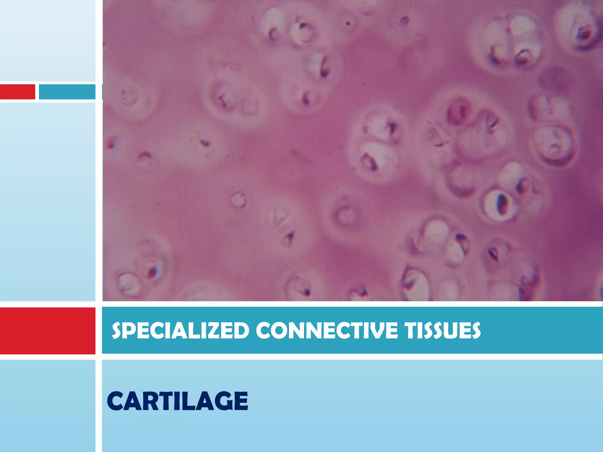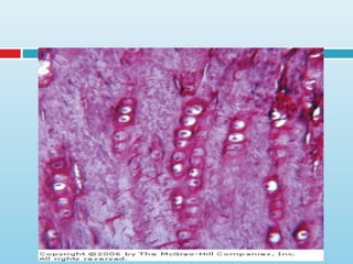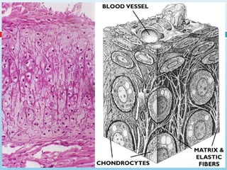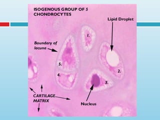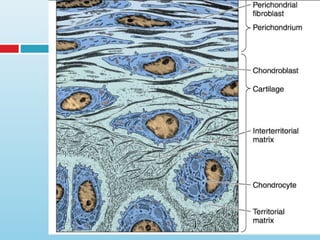 Cartilage is a specialized connective tissue composed of cells called chondrocytes embedded in an extracellular matrix. There are three main types of cartilage - hyaline cartilage, elastic cartilage, and fibrocartilage. Hyaline cartilage is found in joints and respiratory structures. Elastic cartilage is found in the ear and epiglottis due to its elastic properties. Fibrocartilage is a mix of cartilage and dense connective tissue found in intervertebral discs and joints. Cartilage grows through both interstitial growth of chondrocytes within the matrix and appositional growth by perichondrial layer addition to edges. Cartilage has limited self-repair ability due to its avascular nature.