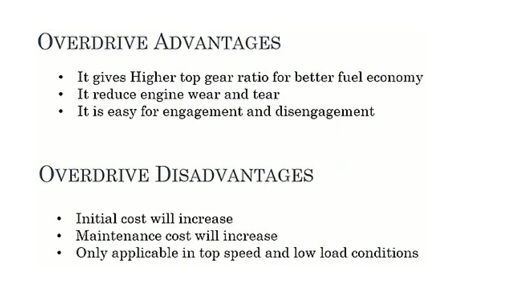 The document provides an overview of overdrive systems in vehicles, explaining its function as a mechanism that allows the propeller shaft to turn faster than the main transmission shaft, enhancing engine efficiency during high-speed operation. It details the construction of the overdrive, including its epicyclic gear train and the role of various components such as the universal joint, propeller shaft, and differential. Additionally, it highlights the Hotchkiss drive system, a historical method of power transmission used in front-engine, rear-wheel-drive cars.