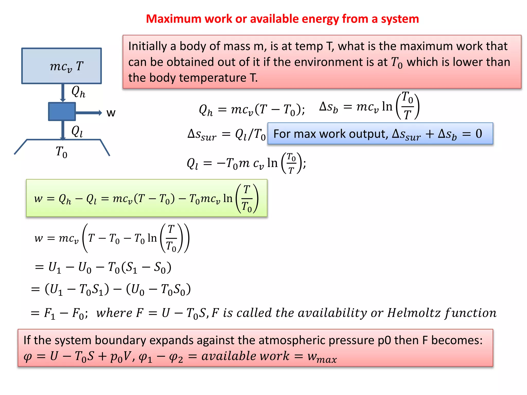 The maximum work that can be obtained from a system initially at a higher temperature T than the environment at T0 is equal to the initial available energy minus the available energy at the final state. For an irreversible process, the actual work is always less than the maximum reversible work, with the difference equal to T0 times the entropy generation. The maximum work from a flow process is equal to the change in availability plus any heat input times 1 minus the ratio of environment to heat source temperatures.