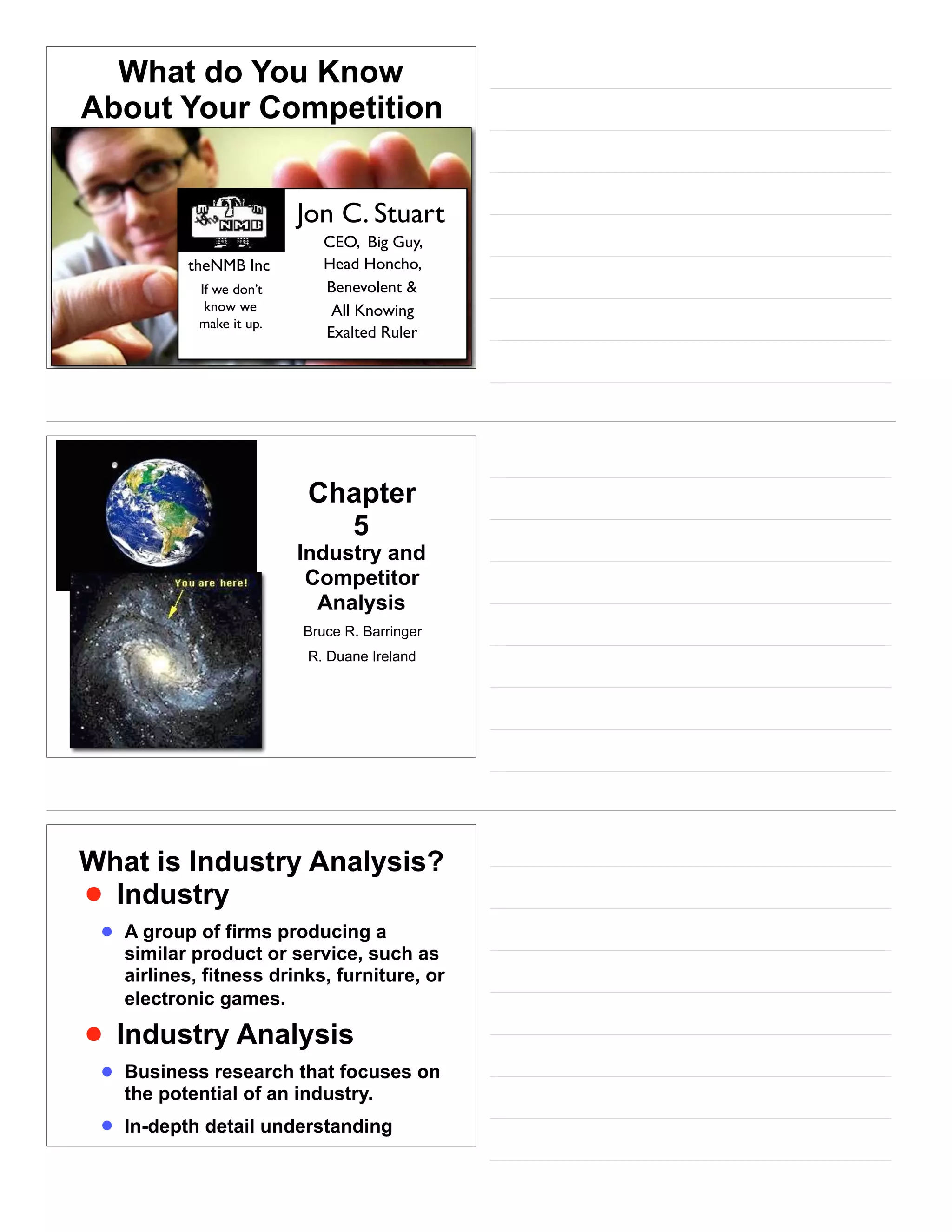 The document provides an overview of industry and competitor analysis. It discusses analyzing industries to understand environmental trends, business trends, and key questions to assess industry attractiveness. It also covers analyzing competitors to identify direct, indirect, and future competitors. Tools discussed include Porter's Five Forces model to evaluate competitive forces in an industry, and a competitive analysis grid to organize information about competitors. The goal of industry and competitor analysis is to help firms understand opportunities and position themselves strategically within their industry.