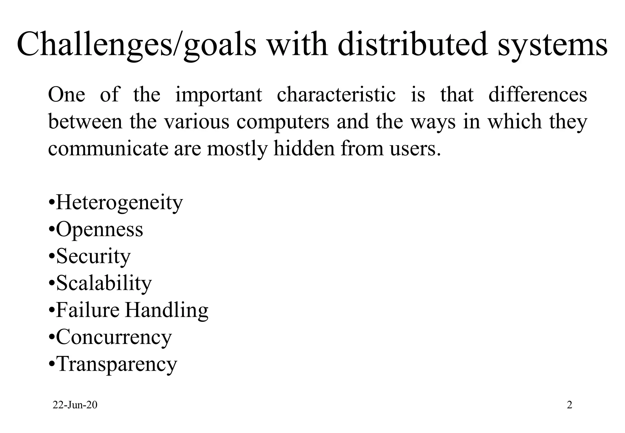 Distributed computer systems aim to hide differences between computers and networks from users. They face challenges including heterogeneity across hardware, software, networks and developers. Distributed systems must also be open, secure, scalable and handle failures and concurrency. Transparency aims to conceal the distributed nature of the system and make resources appear as a single system to users.