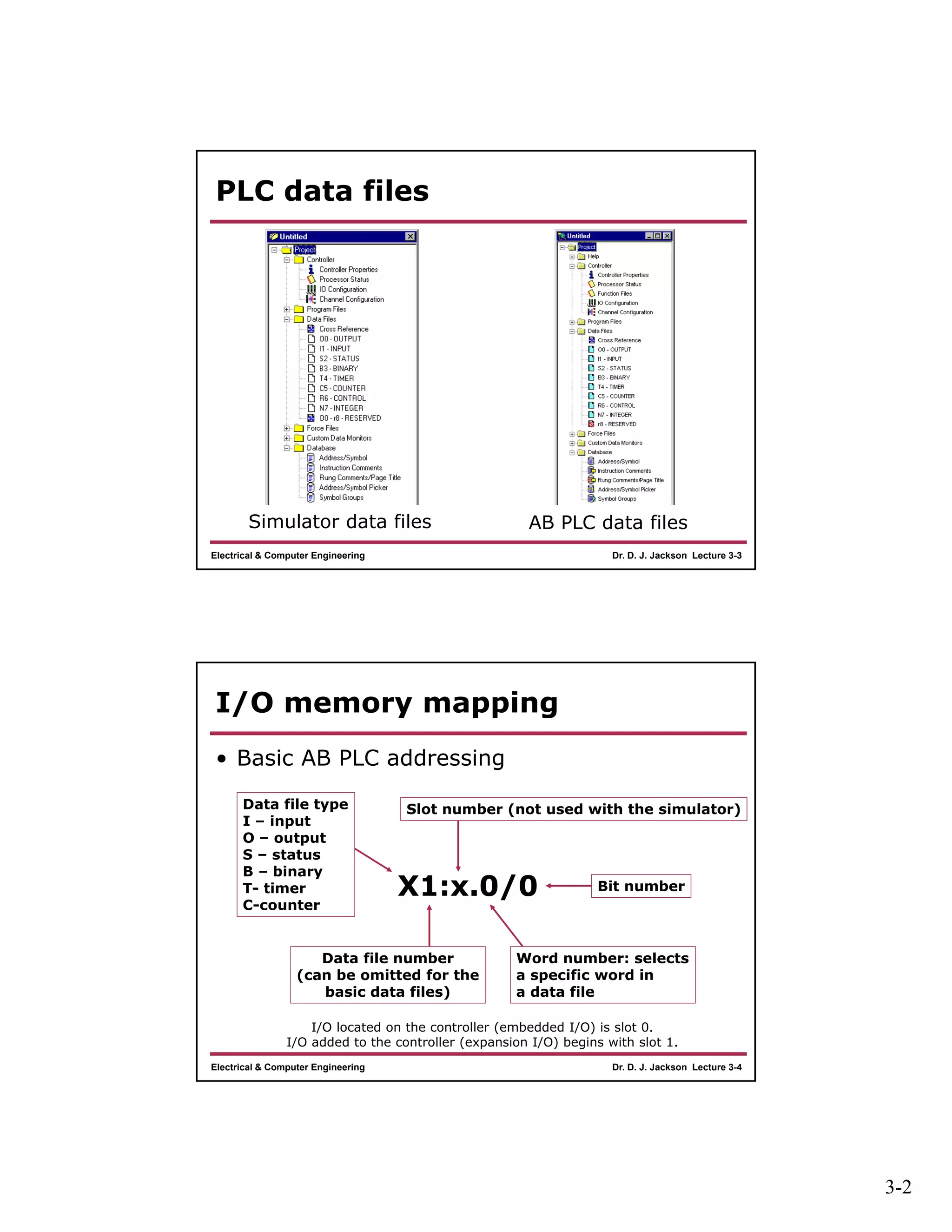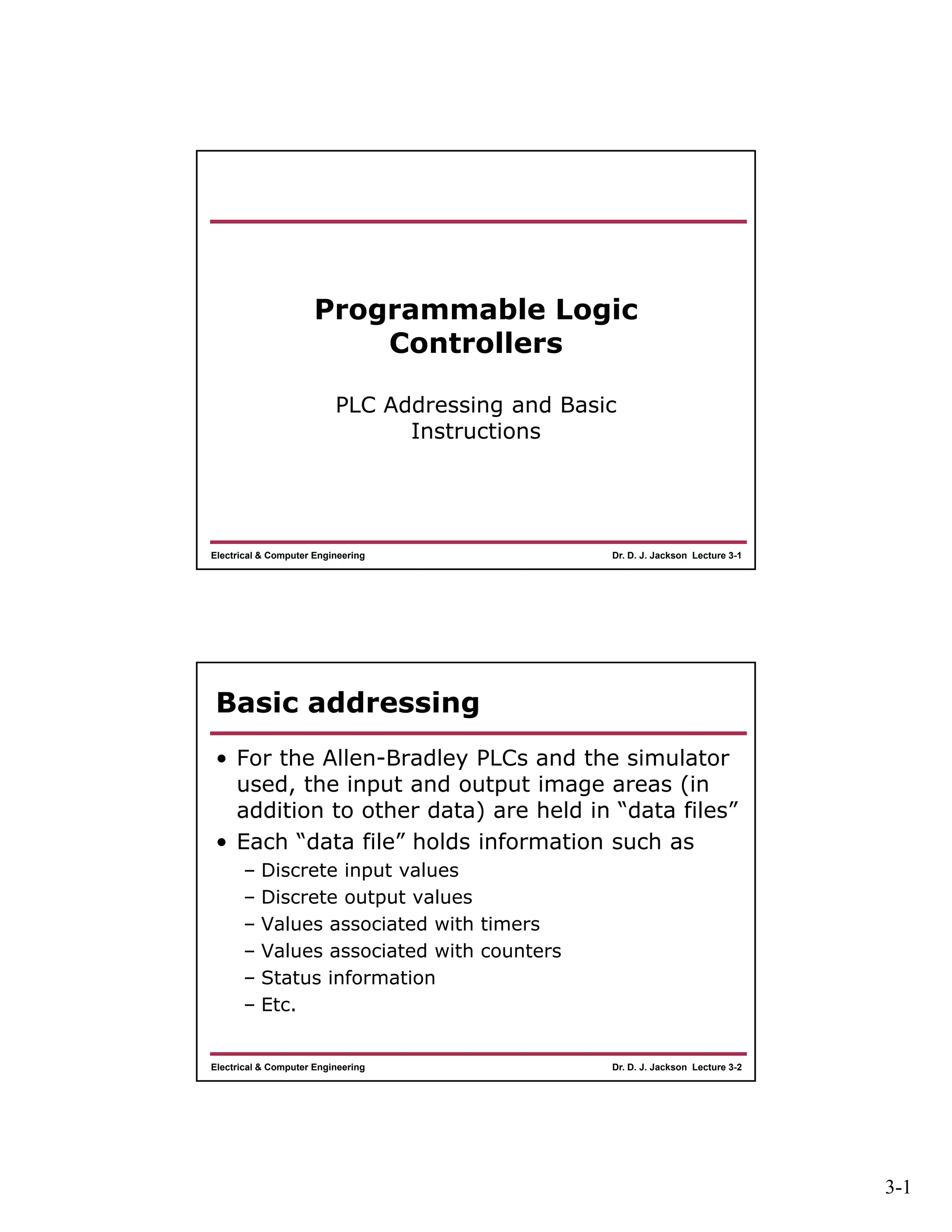 This document discusses Programmable Logic Controllers (PLCs), including PLC addressing, basic instructions like examine if closed (XIC) and output energize (OTE), and using a PLC simulator. It explains how inputs and outputs are mapped to data files and addresses. Basic PLC programming concepts are introduced like branches and parallel logic. The document recommends using the simulator's built-in simulations, like the batch simulator, to design and test ladder logic programs.
