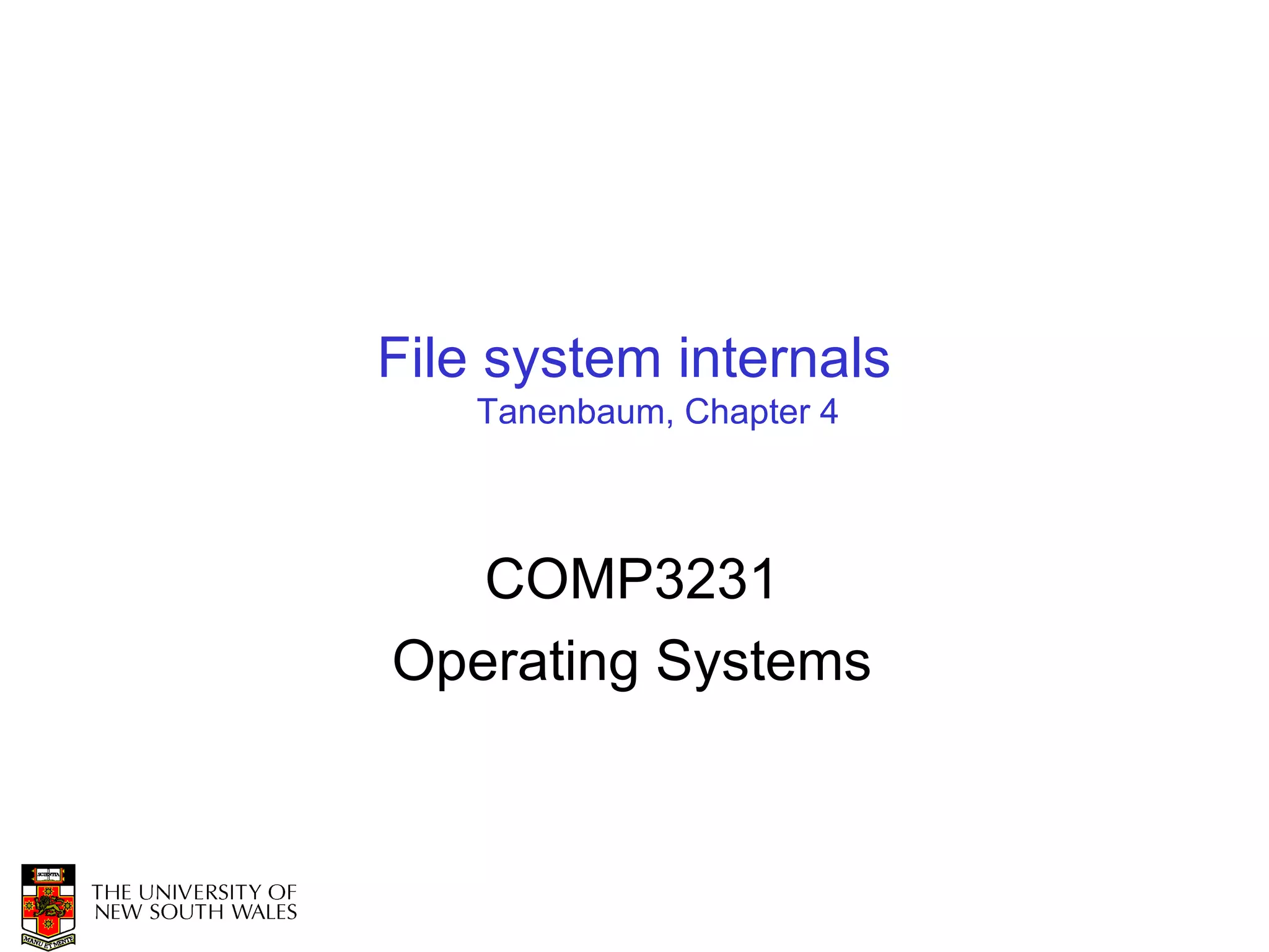 The document discusses file system internals and how operating systems abstract physical storage. It covers common file systems, allocation strategies like contiguous, dynamic, and linked list allocation. Issues like external fragmentation and metadata management are discussed. Directory implementation using inodes and attributes is also summarized.