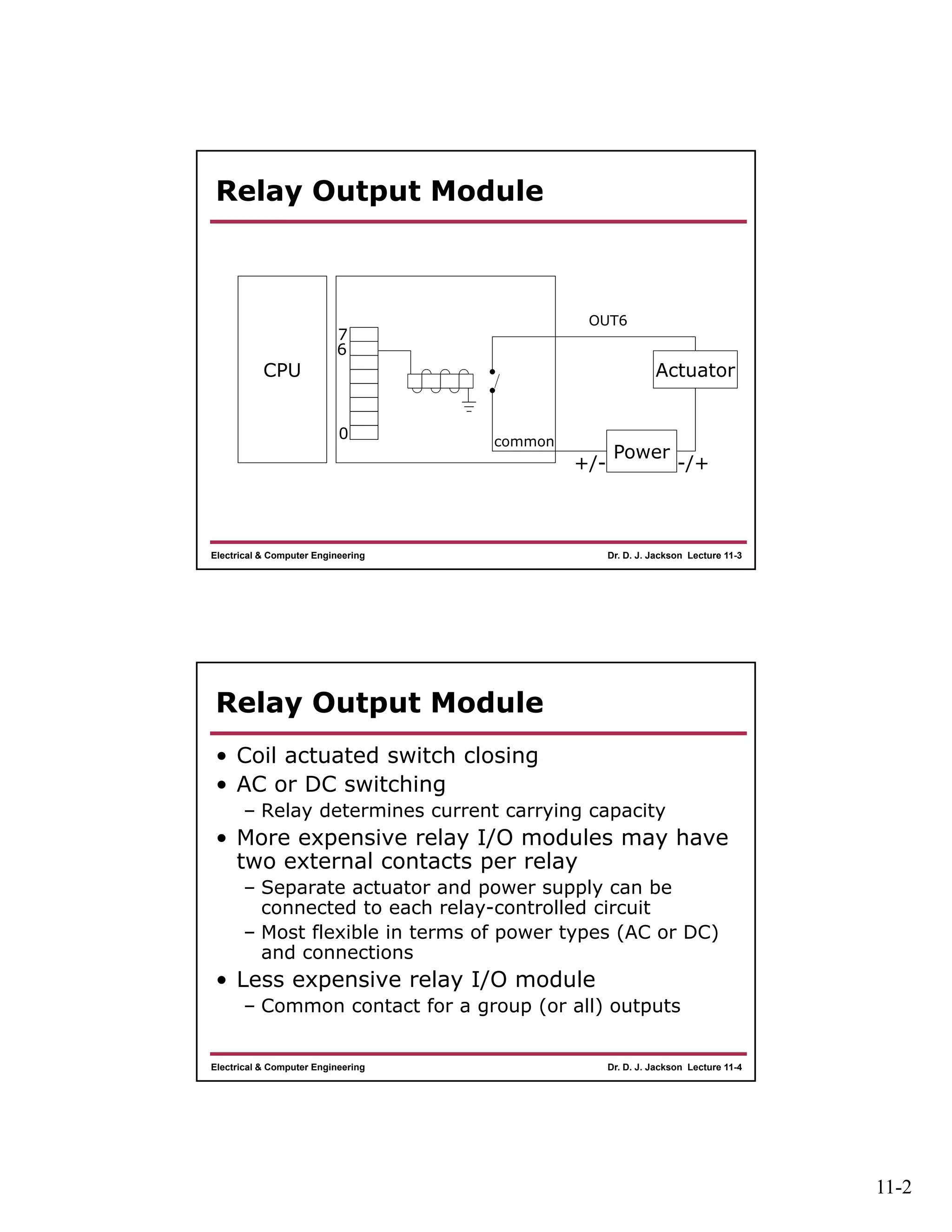 The document discusses different types of input and output modules that can be used in programmable logic controllers (PLCs). It describes relay output modules, transistor-based current sourcing and sinking output modules, and optoisolated current sourcing, sinking, and triac-based input and output modules. It also provides details about configuring and wiring a MicroLogix 1100 PLC trainer, including connection of pushbuttons, toggle switches, and relay outputs. Status and data files for analog input/output modules are also summarized.