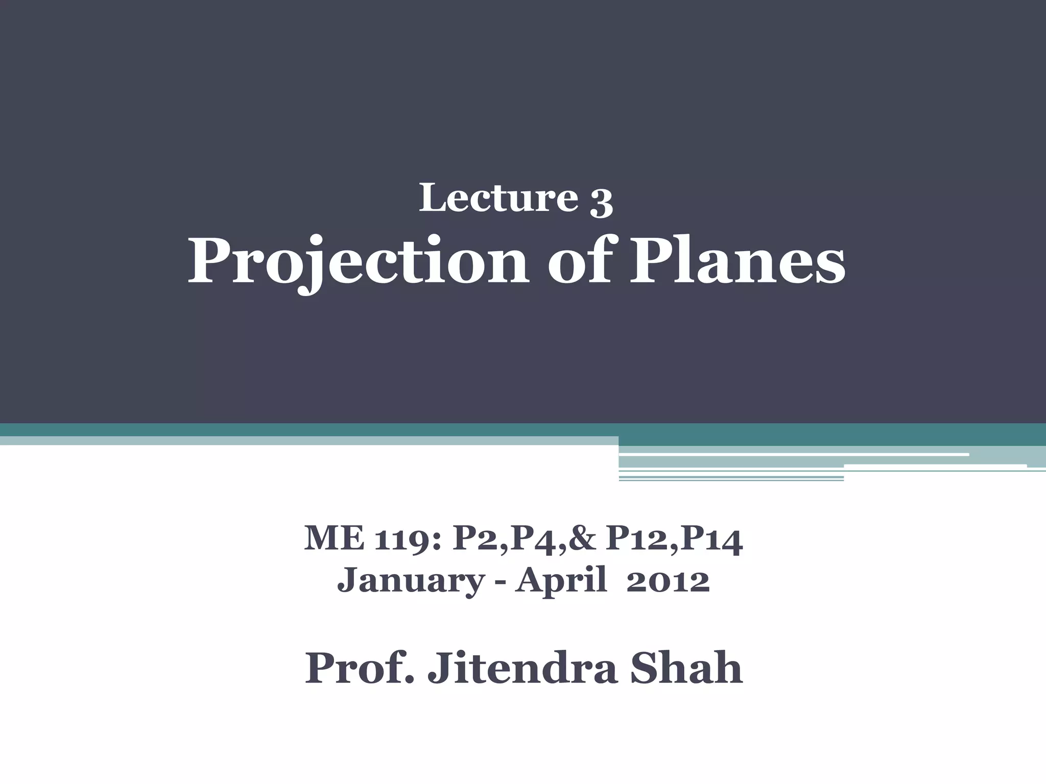 The document discusses the process of projecting planes in engineering drawings. It provides examples of projecting a pentagonal lamina with a circular hole and a regular hexagonal lamina with a central hole. The key steps are: 1) Drawing the top view with the plane parallel to the horizontal plane; 2) Projecting points of interest onto the front view; 3) Rotating the front view to the specified inclination angle; 4) Drawing new projectors from the rotated front view to the original top view to obtain the inclined top view.