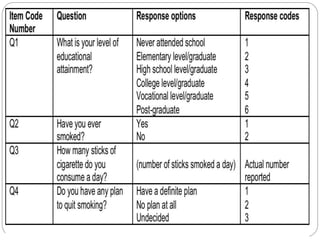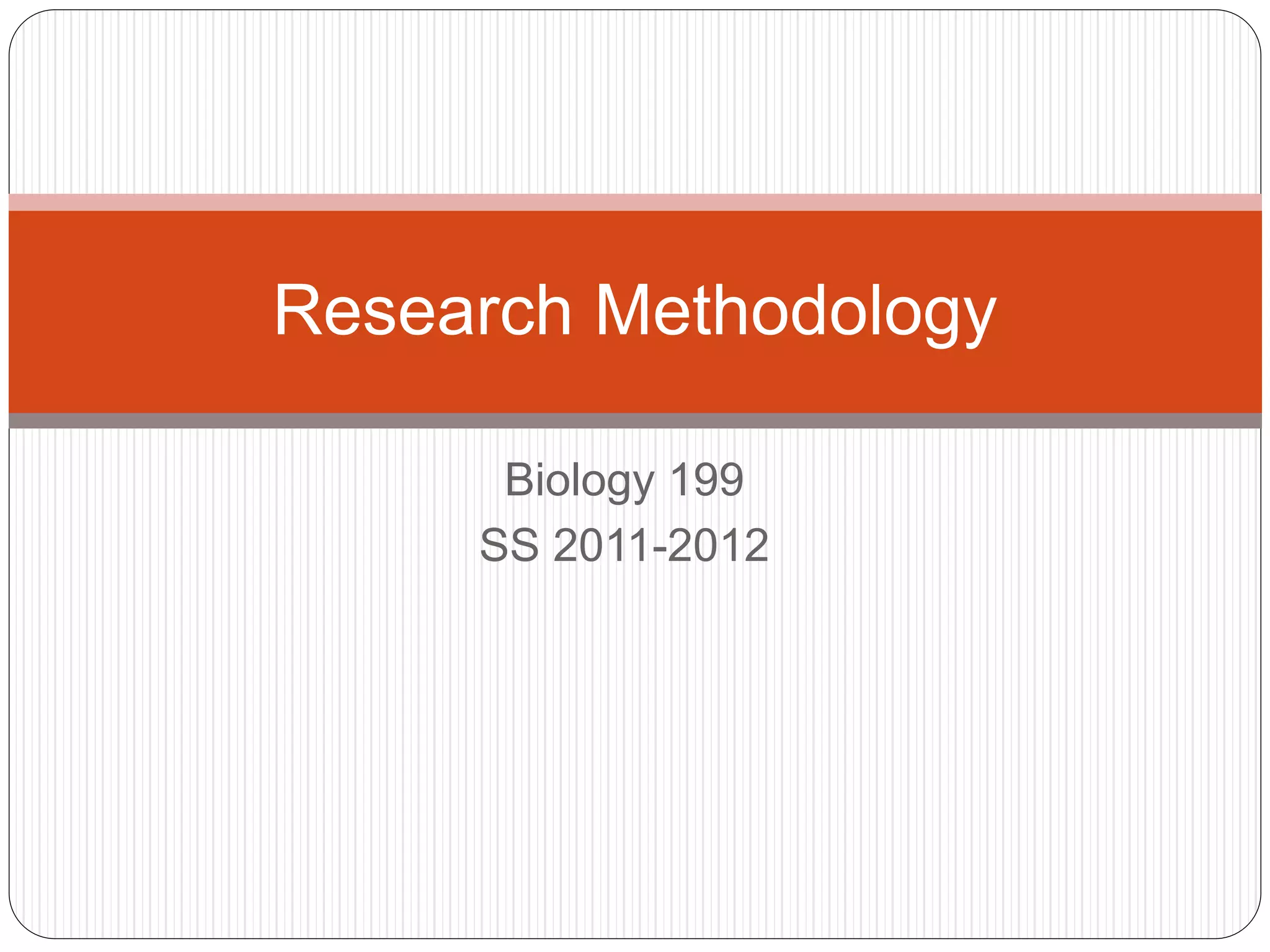 This document discusses research methodology and design. It covers key aspects of research design including selecting subjects, controlling variables, establishing evaluation criteria, and ensuring internal and external validity. Factors to consider in research design are the objectives, feasibility, ethics, efficiency, and validity. The document also outlines steps in the research process such as developing data collection tools, planning analysis, collecting and processing data, conducting analysis and interpretation. Statistical tests are matched to different research designs and levels of measurement.