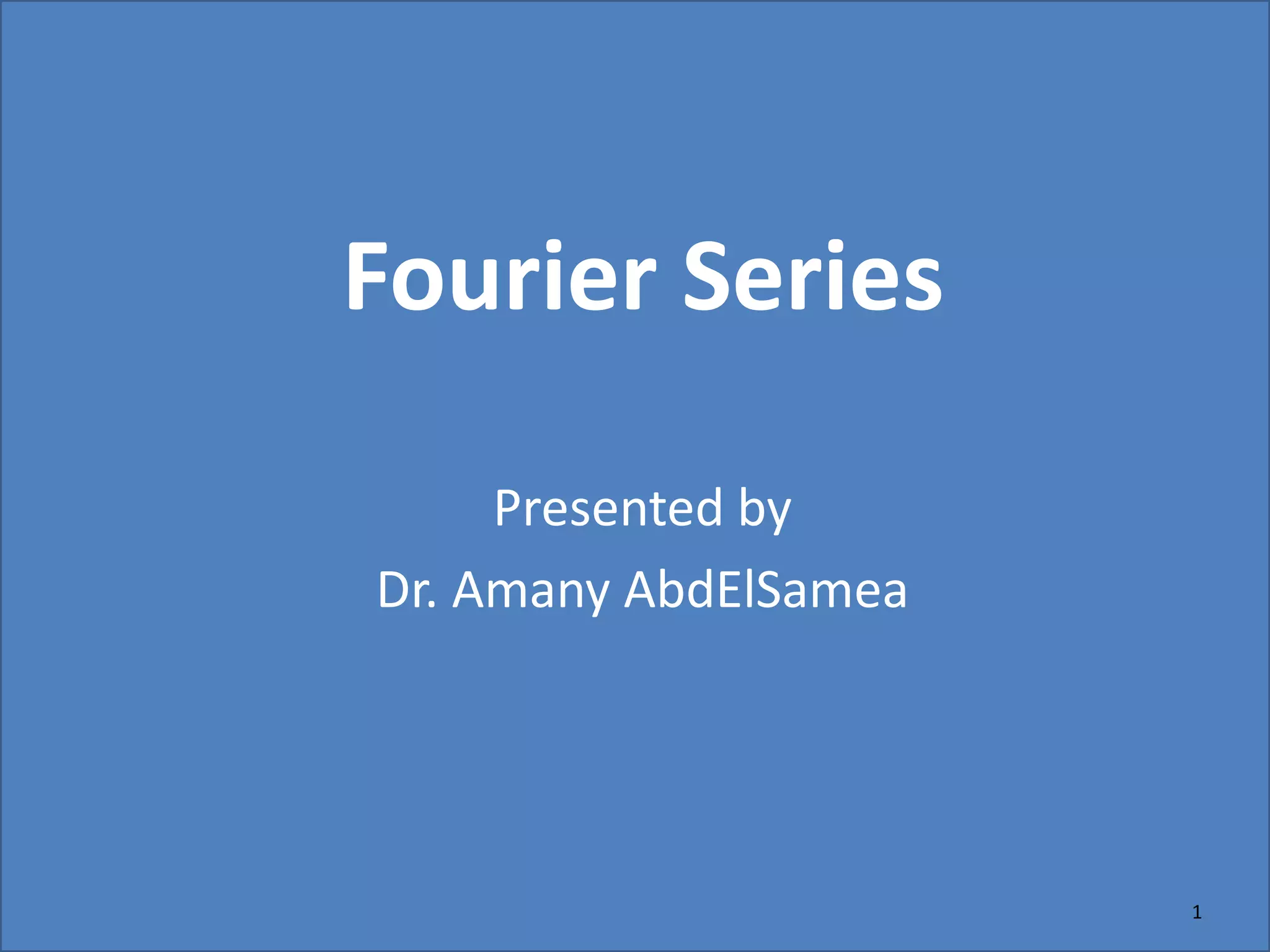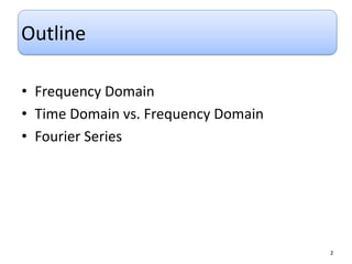 This document discusses Fourier series and the frequency domain. It begins by defining the frequency domain as analyzing signals based on frequency rather than time. The frequency spectrum shows the amplitudes and phases of frequency components. Fourier series can be used to analyze periodic signals by expressing them as sums of sinusoids. There are different types of Fourier series including trigonometric, complex exponential, and cosine with phase. Fourier series satisfy Dirichlet conditions of being periodic, having a finite number of discontinuities and maxima/minima to be absolutely integrable. Examples are provided of applying Fourier series to periodic signals.