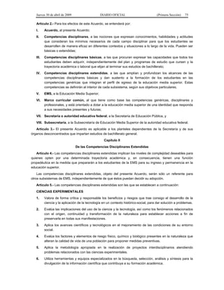 Este documento establece las competencias disciplinares extendidas para el bachillerato general en México. Define competencias adicionales en las áreas de ciencias experimentales, ciencias sociales y comunicación, que profundizan los conocimientos más allá de las competencias básicas. No incluye competencias extendidas de matemáticas, considerando que las competencias básicas ya cubren suficientemente el campo. El documento entrará en vigor al día siguiente de su publicación en el Diario Oficial de la Federación.