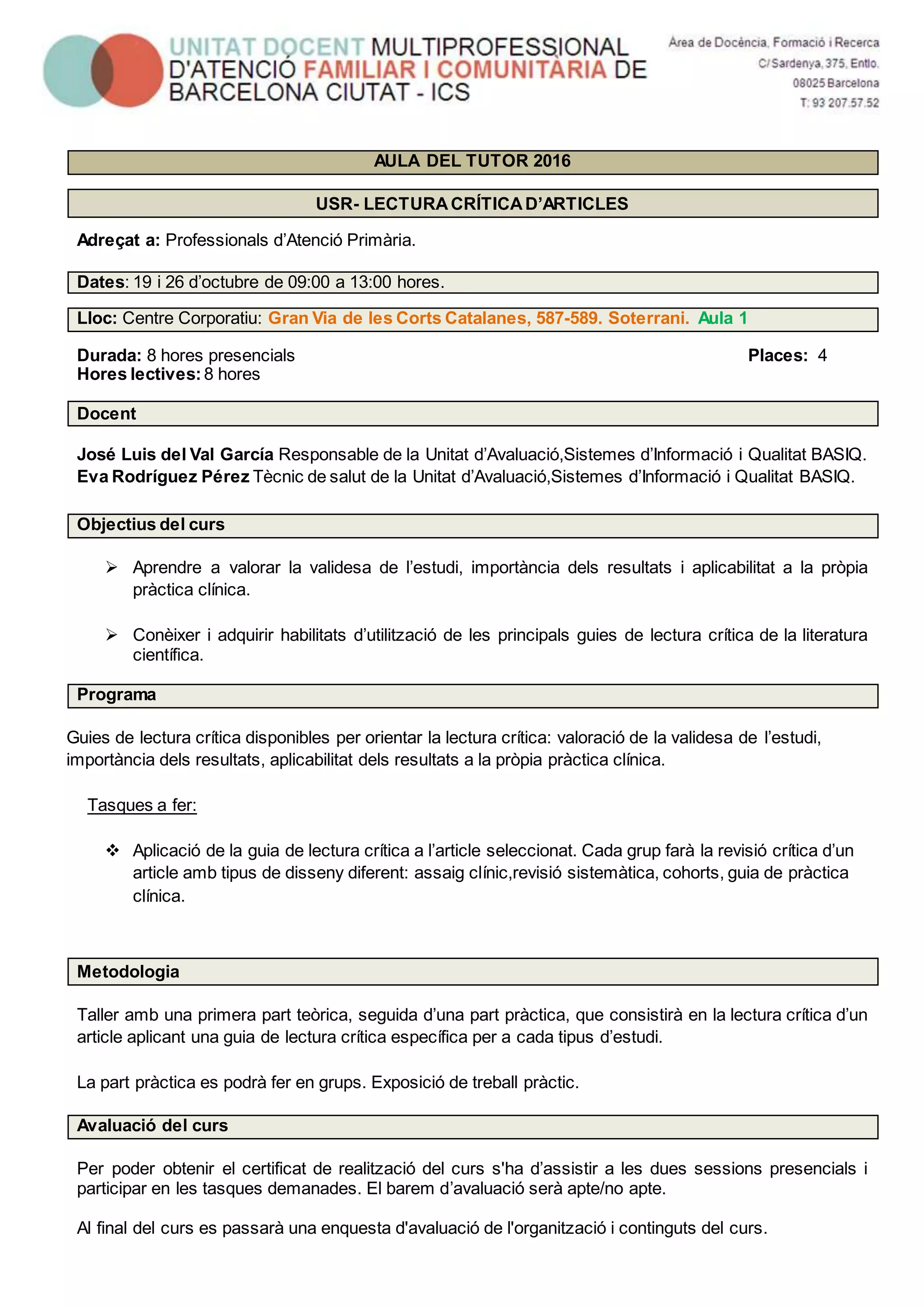 Aplicació de la guia de lectura crítica a l’article seleccionat. Cada grup farà la revisió crítica d’un