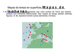 Mapas do tempoen superficie . Mapas de isobaras A B B A As isobaras son liñas imaxinarias que unen puntos da Terra coa mesma presión nun momento determinado. Nos mapas do tempo adoitan distintas figuras ( A, B). Aparecen tamén outros elementos ( frontes)