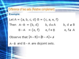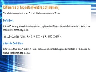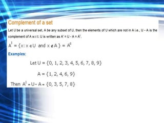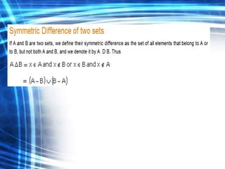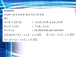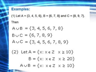 The document discusses sets and operations involving sets of real numbers. It defines key sets such as the real numbers, rational numbers, integers, natural numbers, whole numbers, and irrational numbers. It also covers properties of real numbers like closure, commutativity, associativity, distributivity, identity, and inverse properties as they relate to addition and multiplication. Examples are provided to illustrate set notation and properties. The document contains exercises asking to identify which properties justify certain statements involving real number operations.