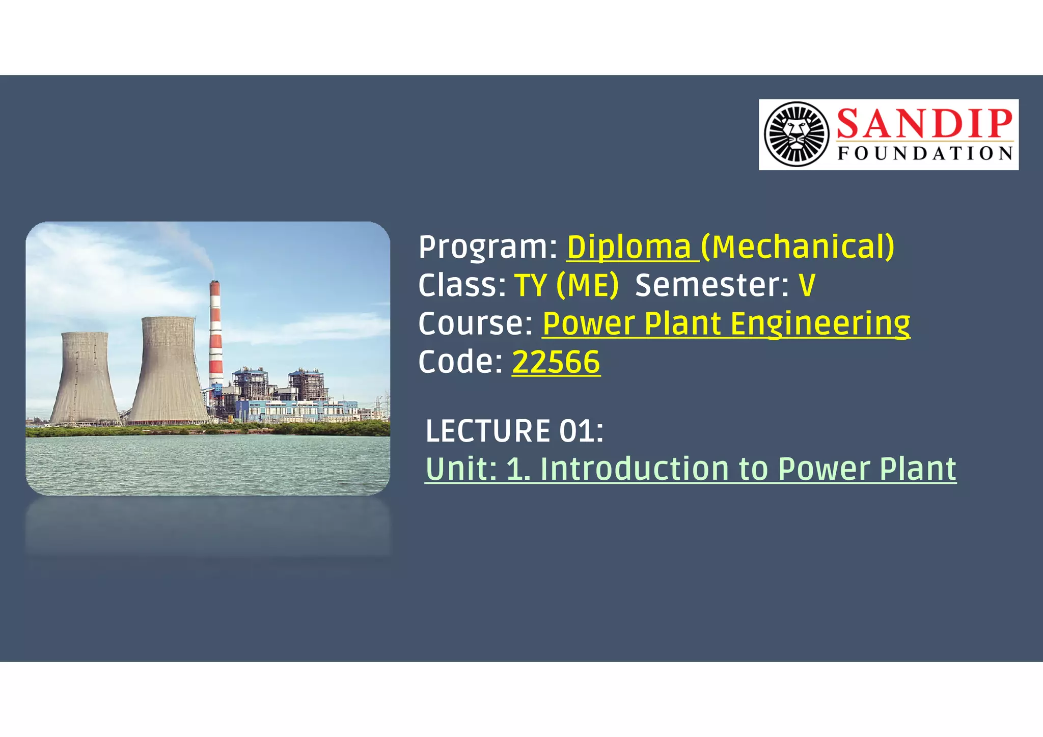 The document outlines the Power Plant Engineering course for fifth-semester mechanical engineering students at Sandip Polytechnic, Nashik, taught by Prof. Rushikesh Sonar. It includes course objectives and outcomes, covering various power plant components, types, maintenance procedures, and the importance of energy in industrial contexts. Additionally, it discusses India's energy scenario, including renewable energy progress and consumption statistics from various sources.