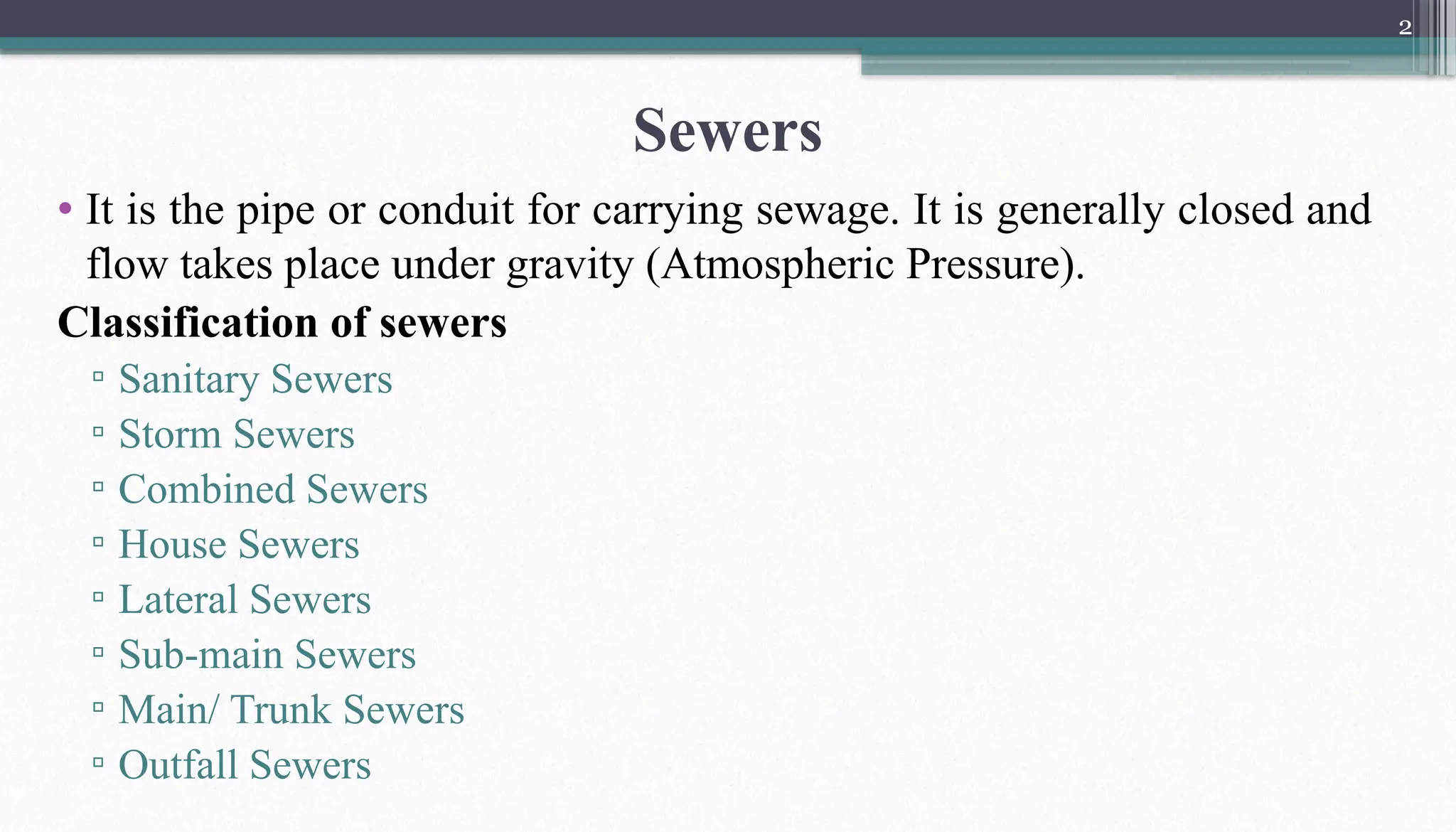 • It isthe pipe or conduit for carrying sewage. It is generally closed and