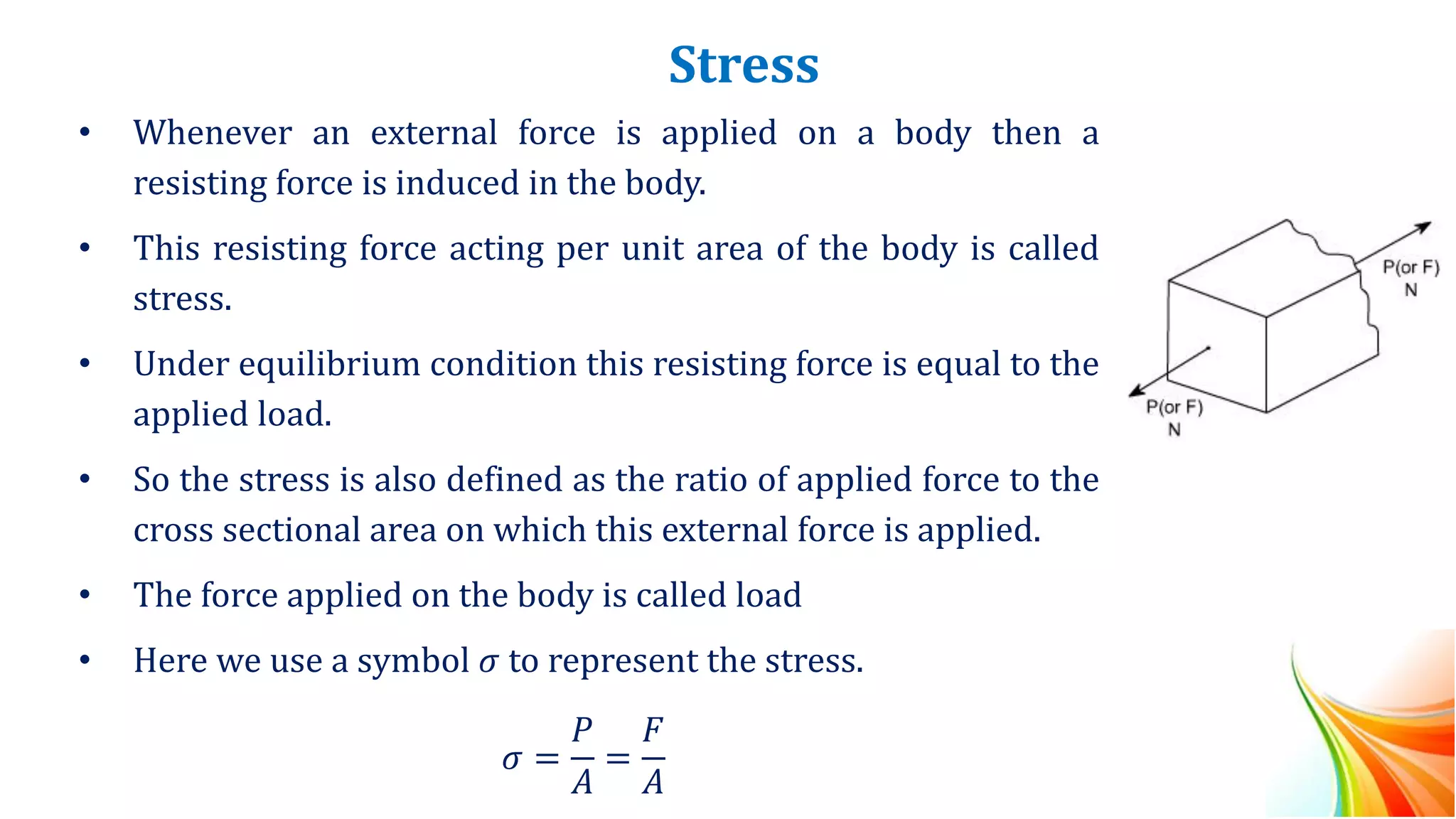 - Stress is defined as the internal resisting force induced per unit area when an external force is applied. The two basic types of stress are normal stress and shear stress.