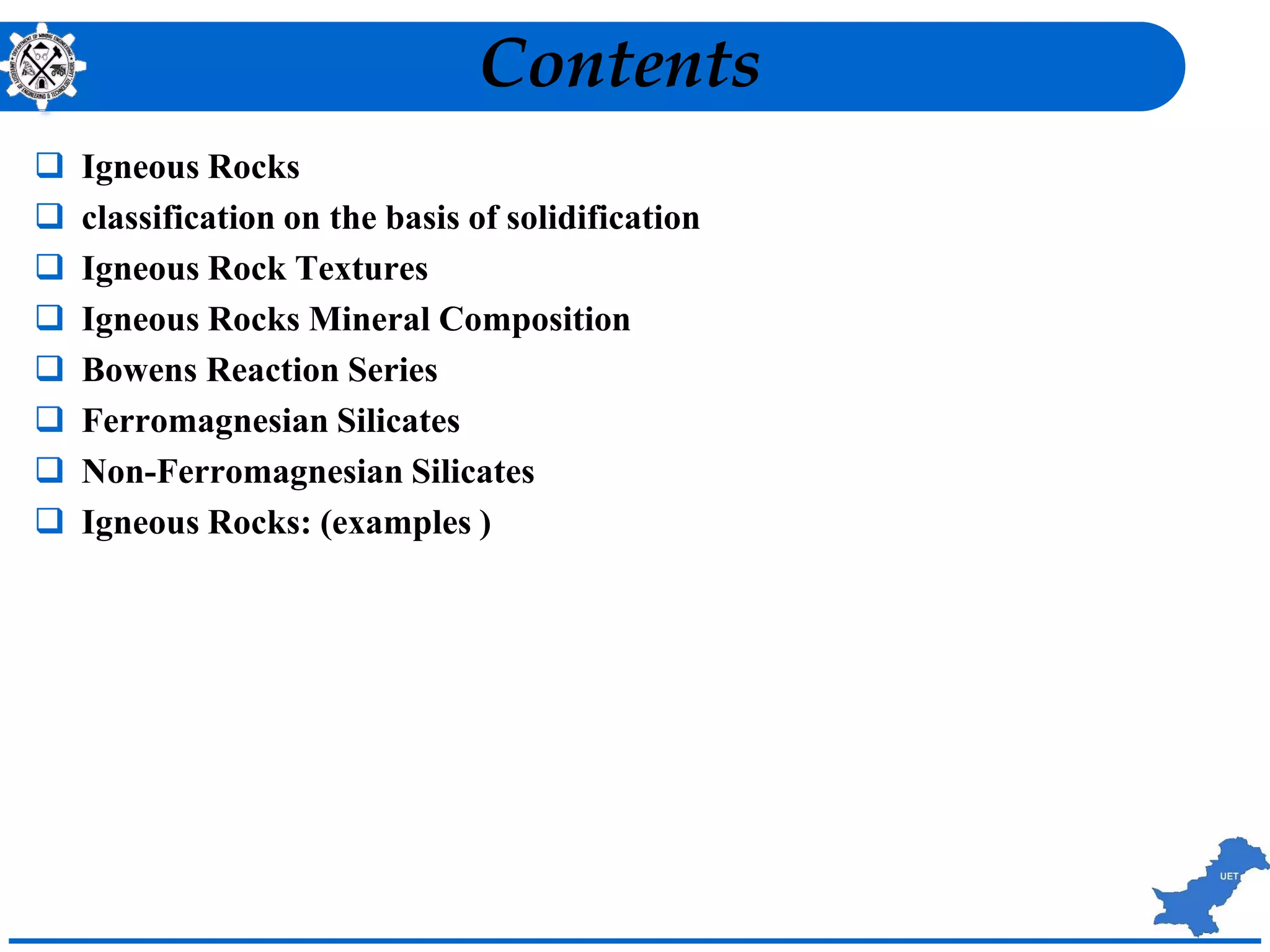 The document discusses different types of igneous rocks and their characteristics. It describes how igneous rocks form from the cooling of magma and lava and are classified as intrusive or extrusive. Intrusive igneous rocks cool slowly below the Earth's surface, forming textures like phaneritic, while extrusive rocks cool rapidly above ground, resulting in aphanitic or glassy textures. The document outlines various igneous rock textures and features like vesicles, phenocrysts and pyroclastic materials.