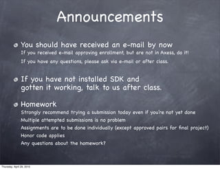 This document provides an overview and announcements for the CS193p Spring 2010 class. It covers topics like installing the SDK, homework assignments, communication methods, and an outline of topics to be covered in class that day, including Objective-C concepts like instance variables, methods, properties, memory management, and more. Students are reminded to submit homework and ask questions via email.