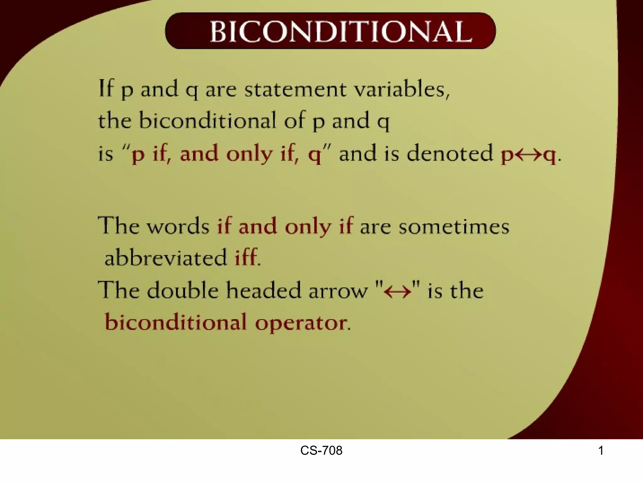 The document contains sections from a course on logic and logical operators like biconditional, disjunction, conjunction and negation. It includes truth tables to define logical expressions, examples of applying logical operators, and exercises to practice logical equivalence and applications of logical laws.