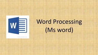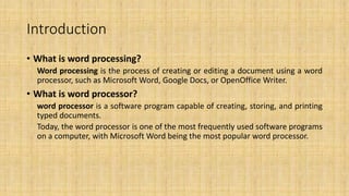 The document discusses features and formatting options in Microsoft Word. It begins with an introduction to word processing and word processors in general. It then details specific features of MS Word like easy typing, spell check, bullets and numbering, headers and footers, tables, pictures, and mail merge. The document provides step-by-step instructions on how to format document layout through adjusting alignment, line spacing, page orientation, paper size, margins, and columns. It also describes how to format fonts by changing size, color, and emphasis. Finally, it discusses applying styles and formatting text.