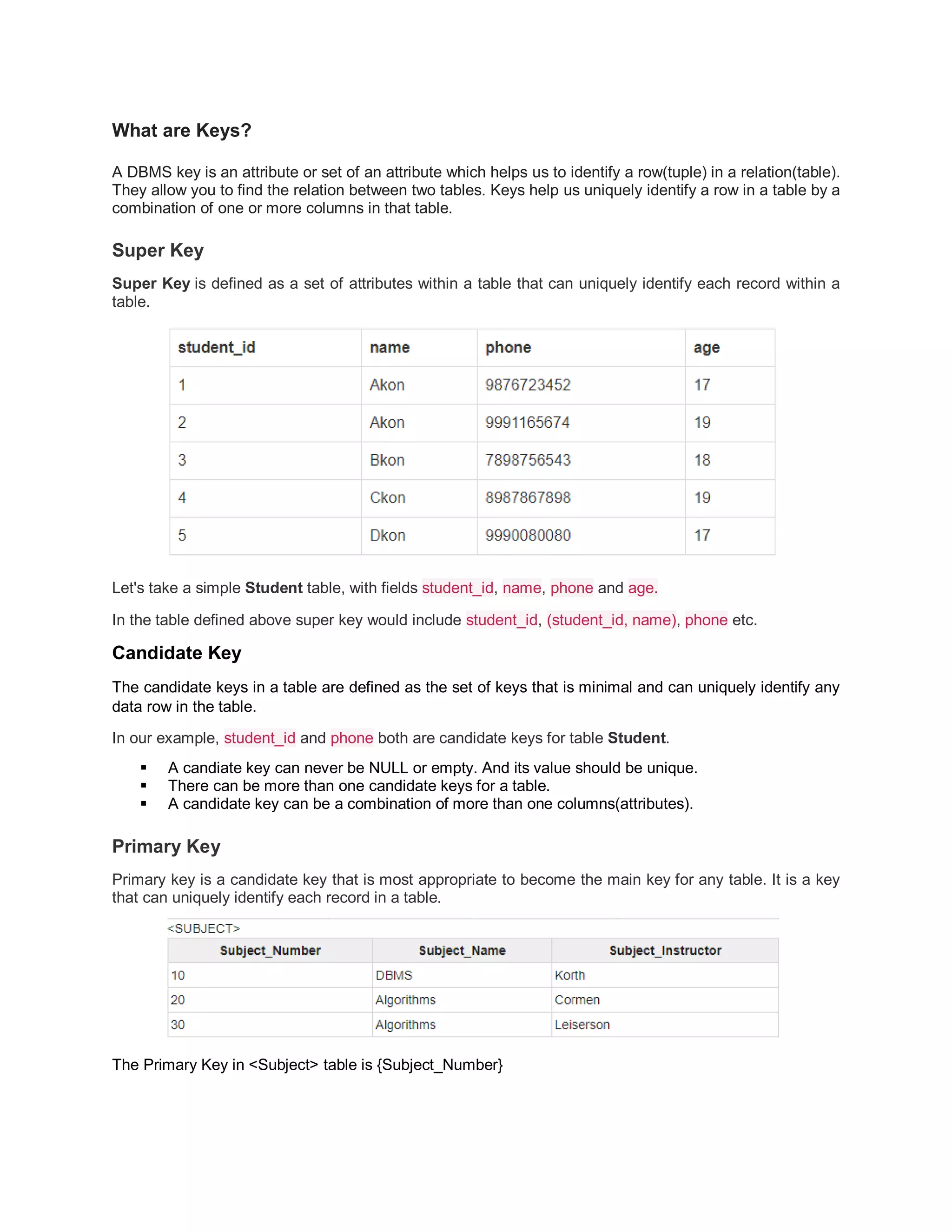 Keys in a database help uniquely identify rows. Super keys can identify rows but may contain redundant attributes, while candidate keys are minimal sets of attributes that uniquely identify rows. The primary key is the chosen candidate key that uniquely identifies each row; foreign keys in one table refer to the primary key of another table to link the tables.