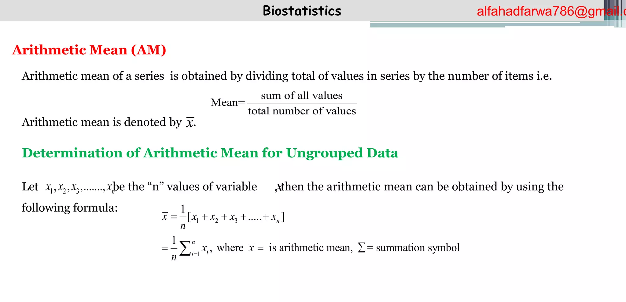 The document discusses the concept of arithmetic mean in biostatistics, detailing methods for calculating it for both ungrouped and grouped data. It includes formulas, examples with plasma potassium values and plant heights, and outlines important properties of the arithmetic mean. The document serves as an educational resource for understanding statistical analysis in biological research.