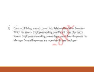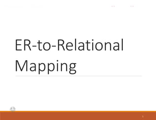 This document discusses the process of mapping an entity-relationship diagram (ERD) to a relational database schema. It outlines 7 steps: 1) creating relations for entity types, 2) handling weak entities, 3) mapping binary 1-to-1 relationships, 4) mapping binary 1-to-many relationships, 5) handling multi-valued attributes, 6) an example application of the steps, and 7) strategies for mapping specialization/generalization relationships between entity types. The document provides examples and diagrams to illustrate how each step in the mapping process transforms the ERD into a relational schema.
