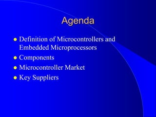 This document provides an overview of microcontrollers and embedded systems. It discusses that microcontrollers are a key technology for controlling various processes and devices. Microcontrollers come in a variety of configurations from 4-bit to 32-bit. The document reviews common microcontroller families like the PIC16F87x and key suppliers in the market. It also notes that embedded systems outsell traditional PC processors by over 99% and the market for microcontrollers was over $16 billion in 2000 with the 8-bit segment comprising over half of shipments.