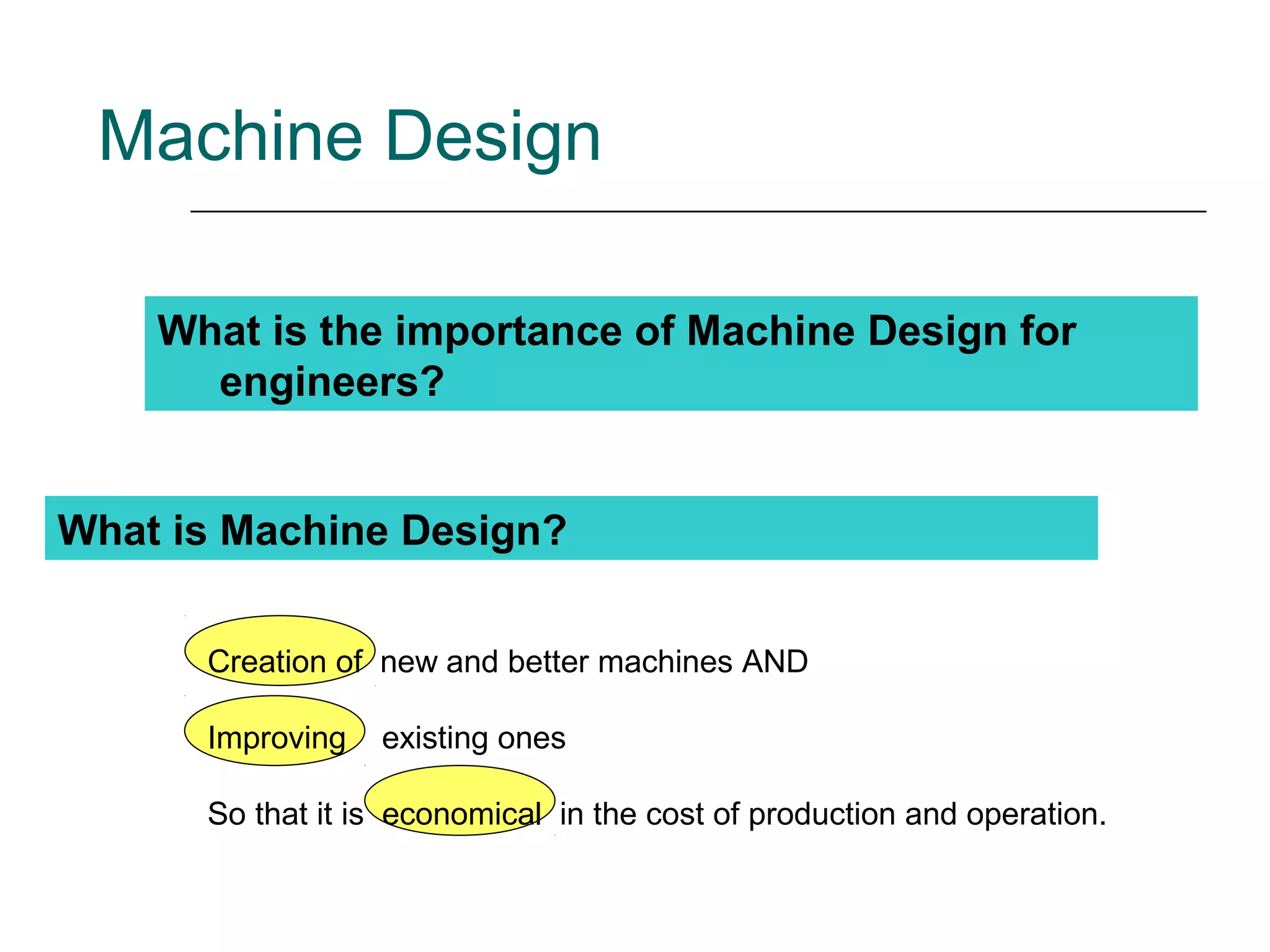 Machine design is the process of creating new machines and improving existing machines so they are economical to produce and operate. The basic knowledge required for machine design includes mathematics, engineering mechanics, strength of materials, workshop processes, engineering drawing, computing, and finite element analysis. The general procedure in machine design involves recognizing the problem, selecting an appropriate mechanism, analyzing stresses on components to determine sizes, modifying sizes to reduce costs, and producing the design. A design engineer is expected to have in-depth technical knowledge, communicate effectively, solve problems innovatively, and stay up to date with technological advances.