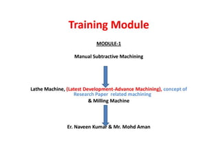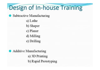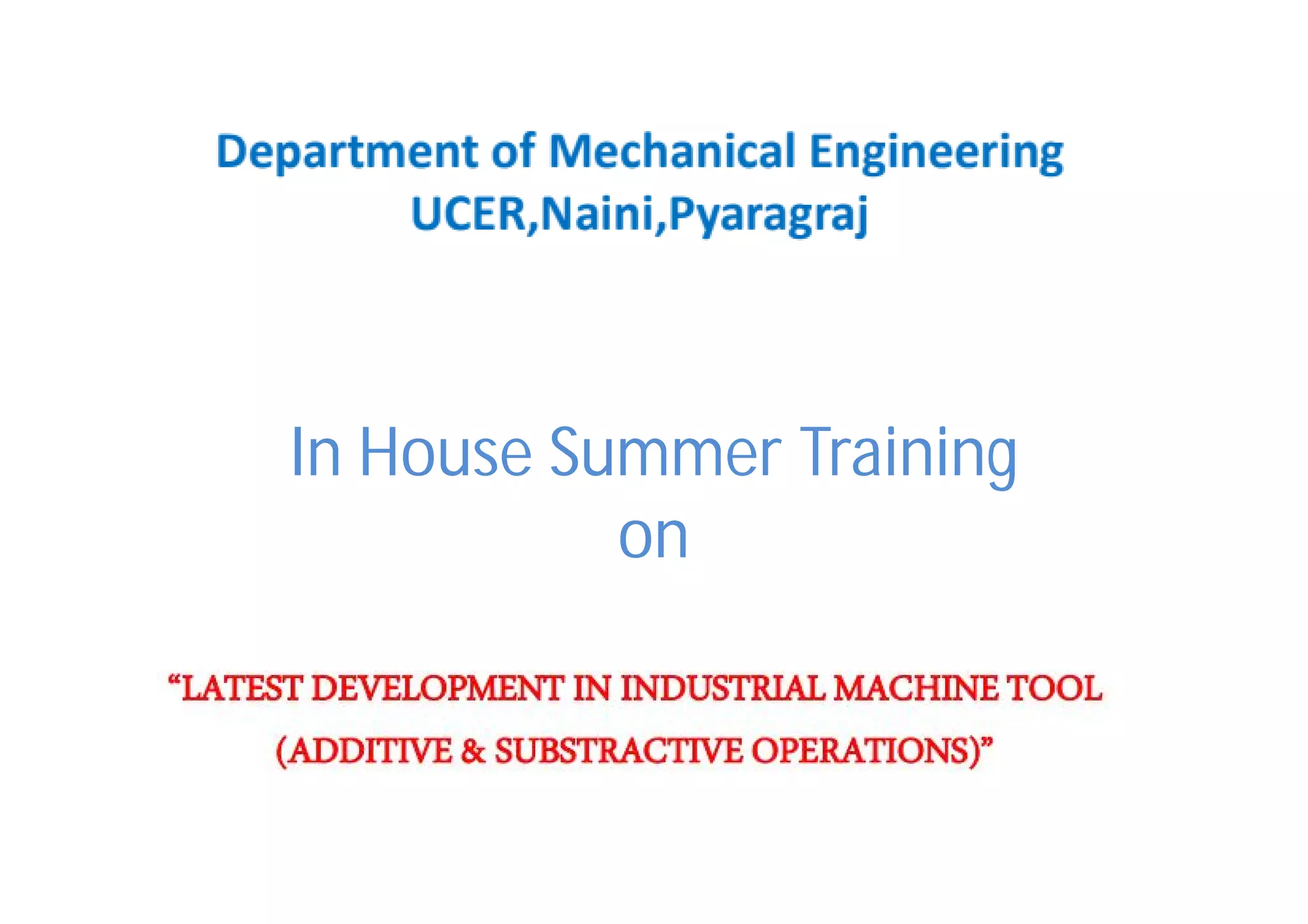 The document provides information about conducting an in-house summer training on CNC lathe machines. It discusses the aims of the training, which are to familiarize trainees with basic CNC machine operations, teach theoretical and practical CNC concepts, and help increase confidence. It also outlines safety precautions and covers various machining operations that can be performed on a CNC lathe like turning, threading, and drilling.