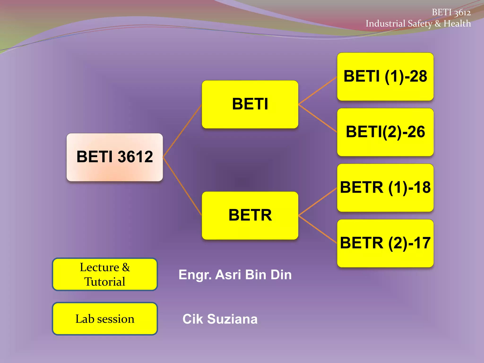 This document provides information about the BETI 3612 Industrial Safety & Health course offered at a university. It includes the course code, instructor details, learning objectives, reference materials, class schedule, and an overview of topics like occupational hazards, risk assessment methods, and regulations under the Occupational Safety and Health Act 1994 of Malaysia. The duties of employers and employees are also summarized. The document aims to equip students with knowledge on ensuring workplace safety, health, and environmental compliance.