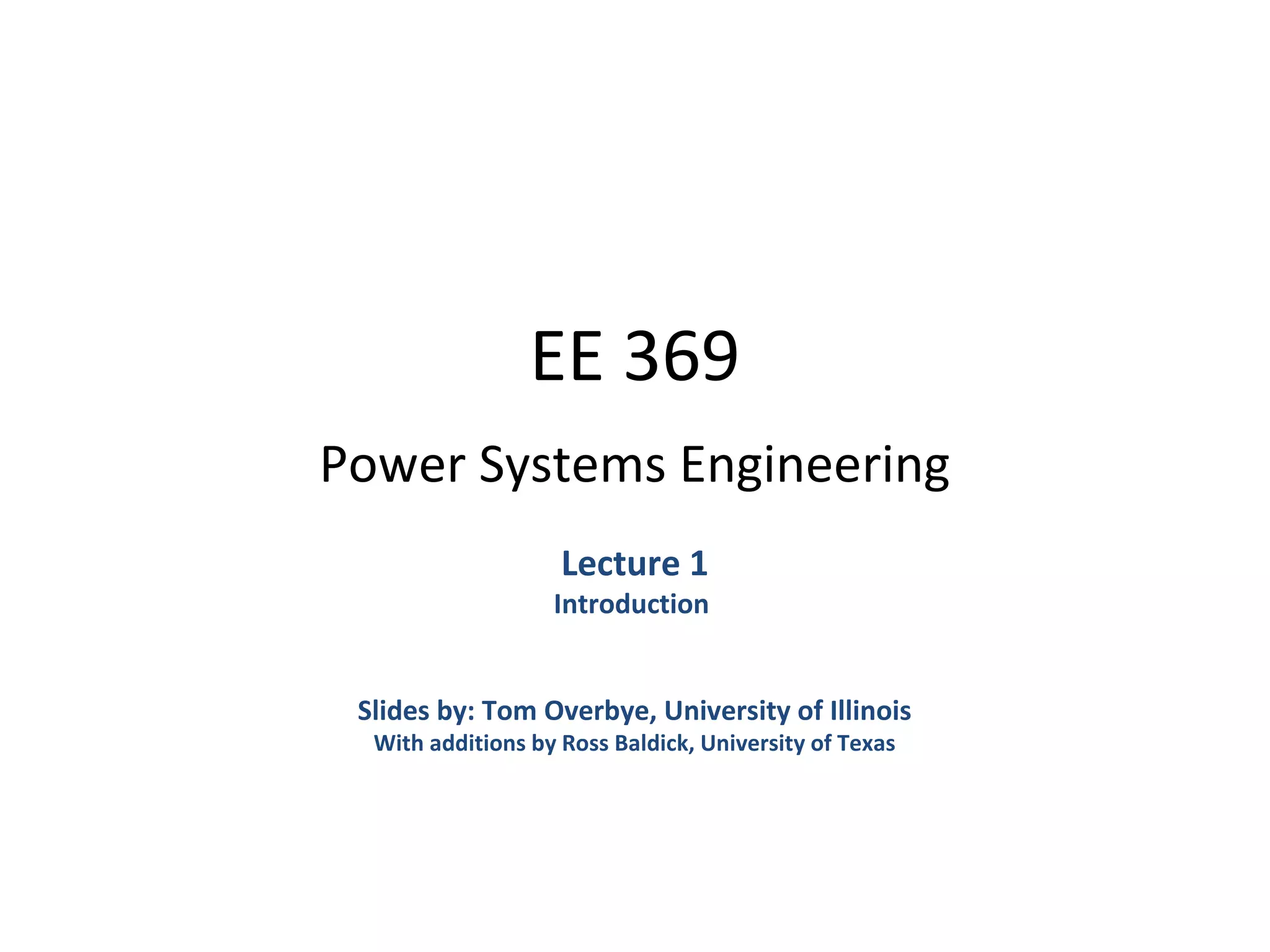 This document provides an introduction to a power systems engineering course. It discusses the basic components of a power system including generation, transmission, distribution and control equipment. It notes that real power systems have complications compared to ideal models. The document defines power and energy units and provides examples of different types of power systems. It discusses the major North American interconnections and puts the electric system in the context of total energy delivery. Finally, it provides a brief history of the electric power industry and discusses the transition to restructured electricity markets in the 1990s and 2000s.