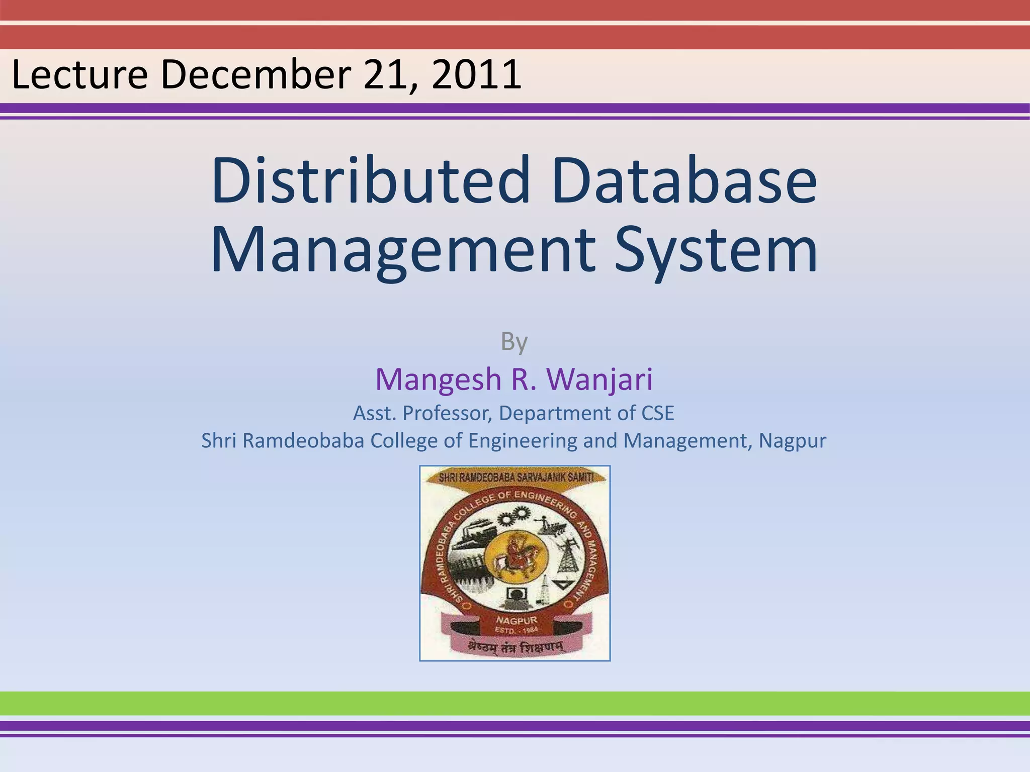 The document discusses distributed database management systems. It begins by covering the evolution of distributed databases from centralized systems in the 1970s to more decentralized structures in the 1980s and 1990s driven by new technologies. The rest of the document covers key topics in distributed databases including definitions, architectures, data fragmentation techniques, distributed transparency, and considerations for distributed database design such as allocation of fragments.