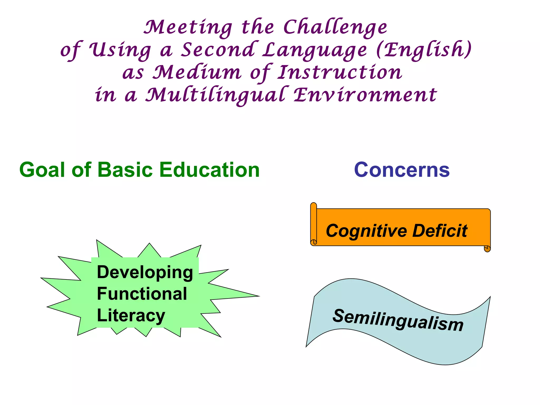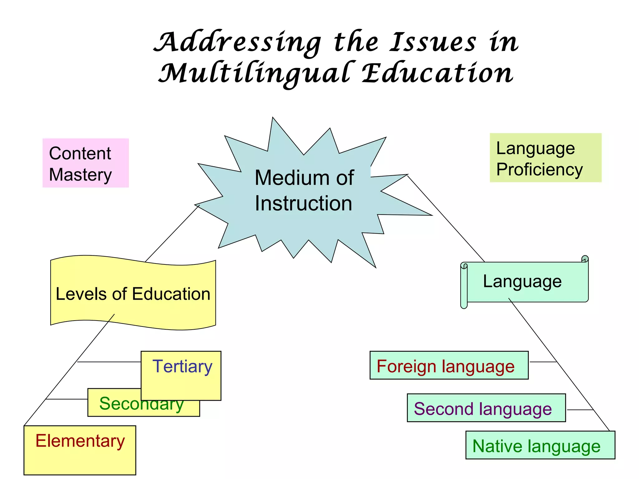 The document discusses issues and approaches regarding multilingual education from preschool through tertiary levels. It addresses using the learner's first language as the primary medium of instruction in early grades to prevent cognitive deficits. In secondary levels, the focus is on developing language skills while allowing code switching. At the tertiary level, content-based and English for Specific Purposes approaches are recommended to develop learner autonomy and content mastery. Discourse analysis techniques are also presented to help learners comprehend dense scientific texts.
