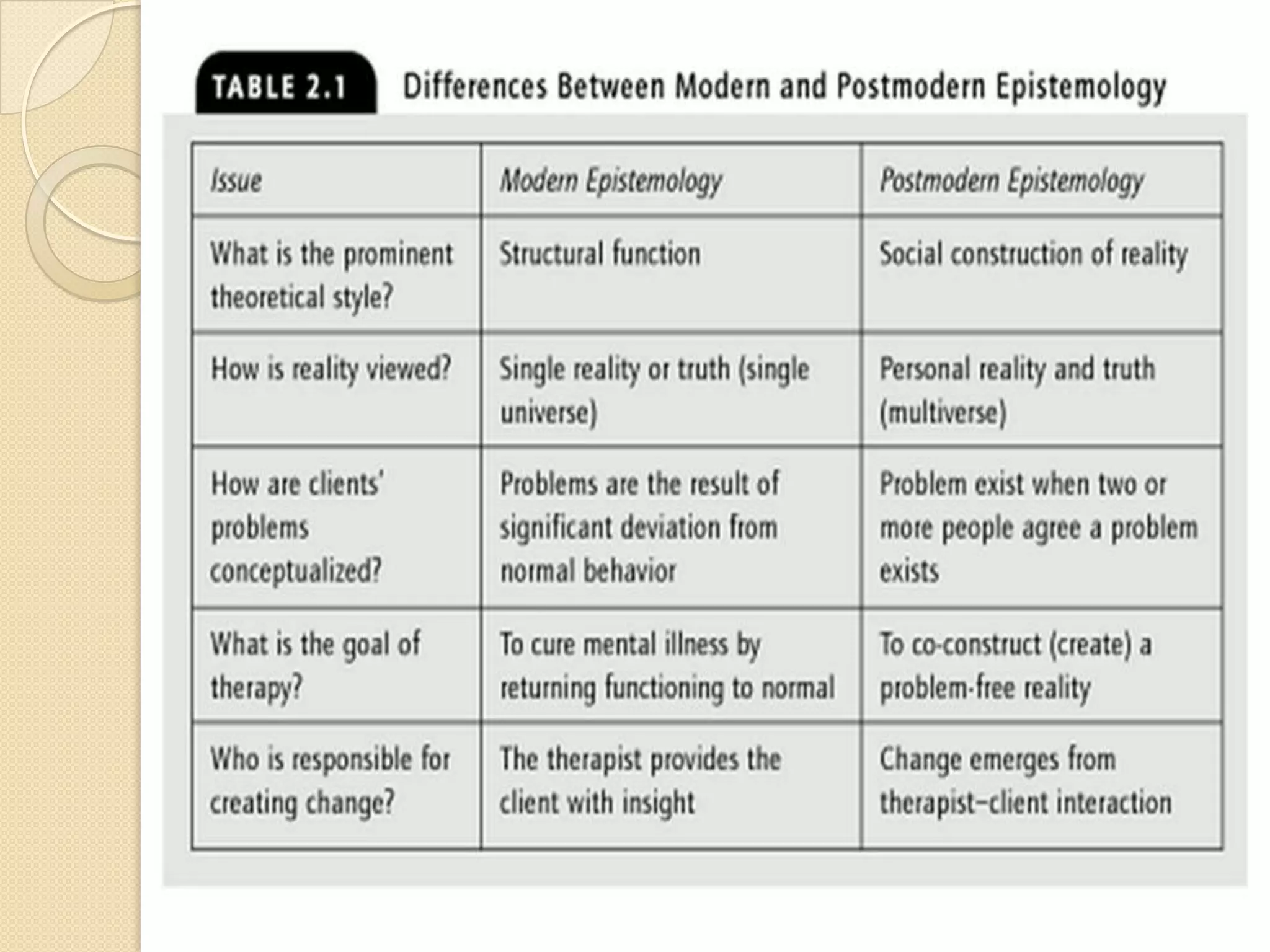 This document provides an overview of the history and development of systemic family therapy. It discusses how the field shifted from a modernist to post-modernist perspective. Originally, problems were seen as arising from dysfunctional family relationships and communication patterns, viewing the self as relational. Later approaches emphasized narrative and social constructionism, examining how meaning is constructed through language. Family therapy incorporated ideas from cybernetics, systems theory, and postmodern concepts like pluralism and contextual truth.