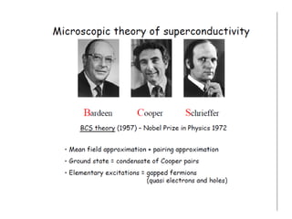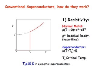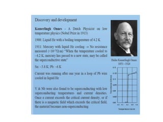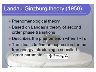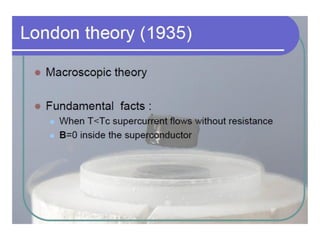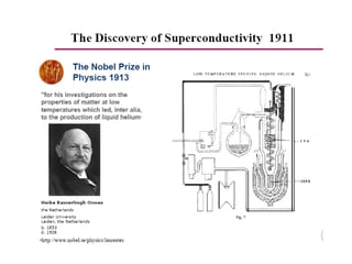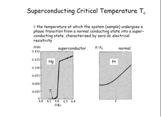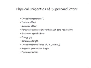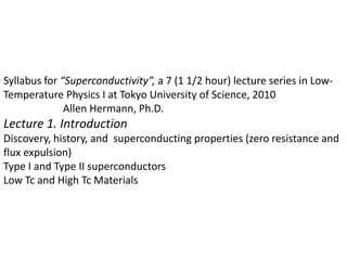 This document contains the syllabus for a 7-lecture series on superconductivity taught at Tokyo University of Science in 2010. The lectures cover topics including the discovery and properties of superconductors, the phenomenology of superfluids and Ginzburg-Landau theory, microscopic BCS theory, Josephson effects, superconducting materials and structures, and applications of superconductivity. The lectures introduce the key concepts and phenomena in superconductivity, including the distinction between type I and type II superconductors, the Meissner effect, flux quantization, and high-temperature superconductors.
