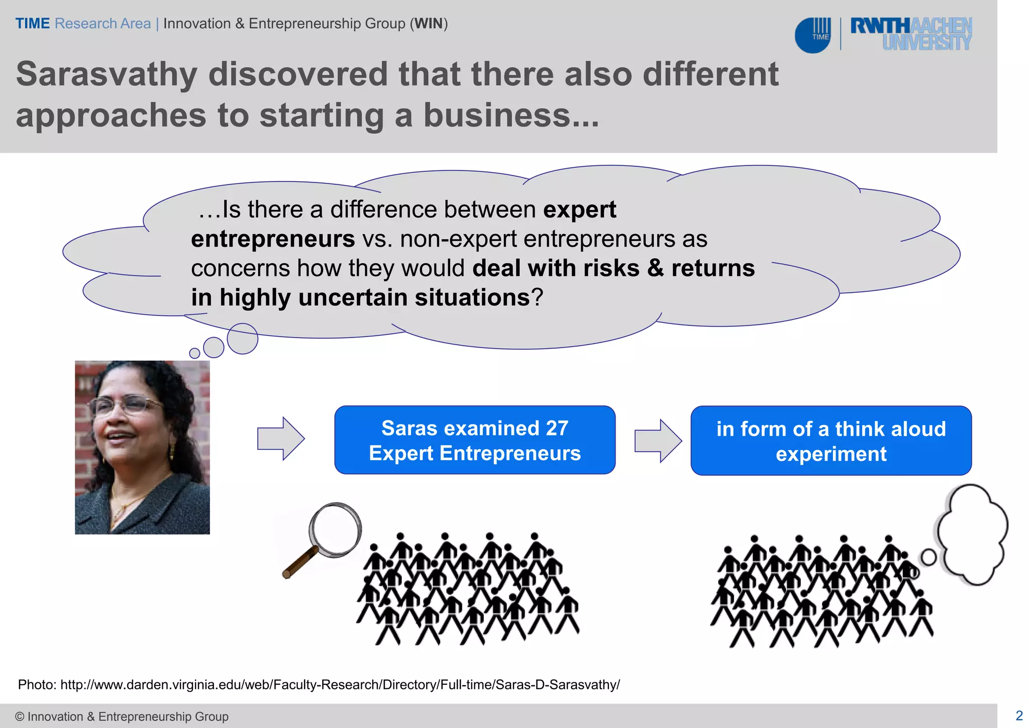 This document summarizes a presentation on effectuation and entrepreneurship. It discusses research by Sarasvathy comparing expert entrepreneurs to novices. Expert entrepreneurs take a effectual approach, focusing on available means rather than predictive markets. They expand resources by making commitments with stakeholders. The document also contrasts effectual and causal logic, and how effectual entrepreneurs view contingencies as new opportunities rather than surprises to avoid.