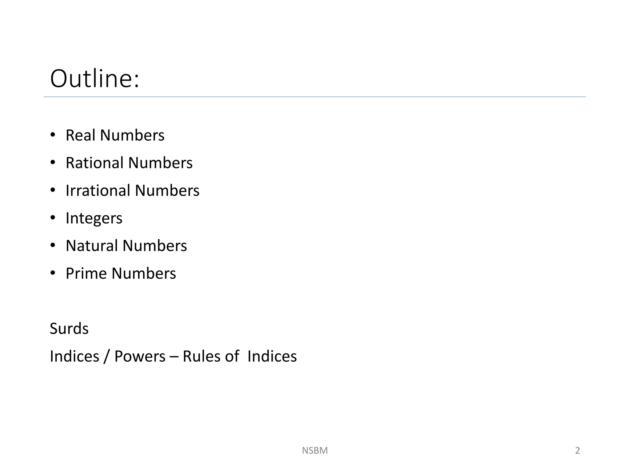 This document provides an outline and information about real numbers, rational numbers, irrational numbers, integers, natural numbers, prime numbers, and indices/powers.